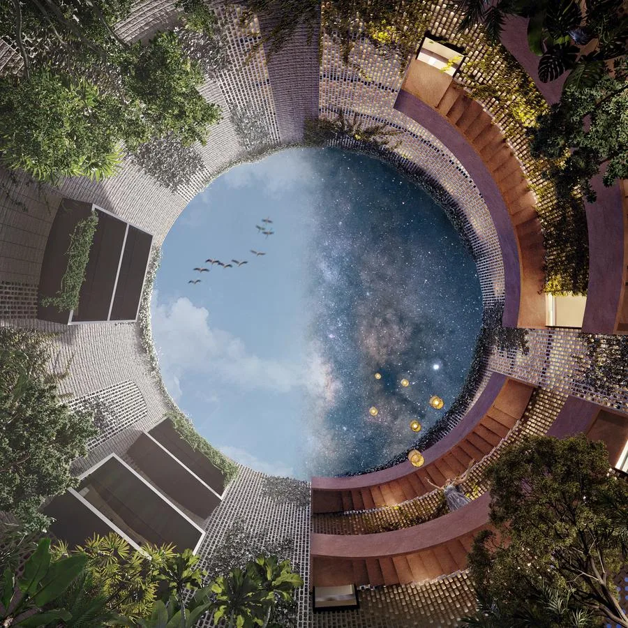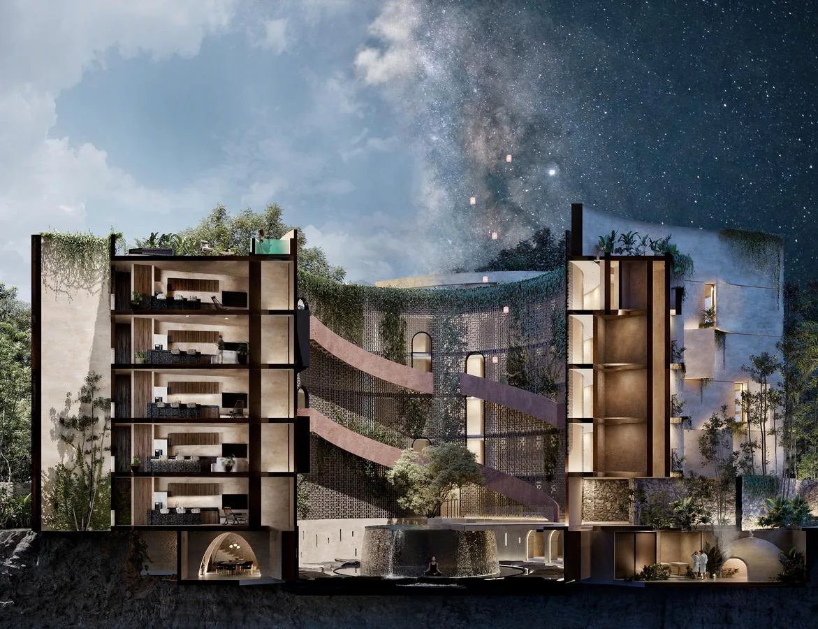 A reflective pool or fountain is present, along with a bar that offers food and wine pairing dining, a cellar, and a kitchen. Wellness facilities consist of a massage area, yoga and meditation space, a temazcal, and an ice bath.