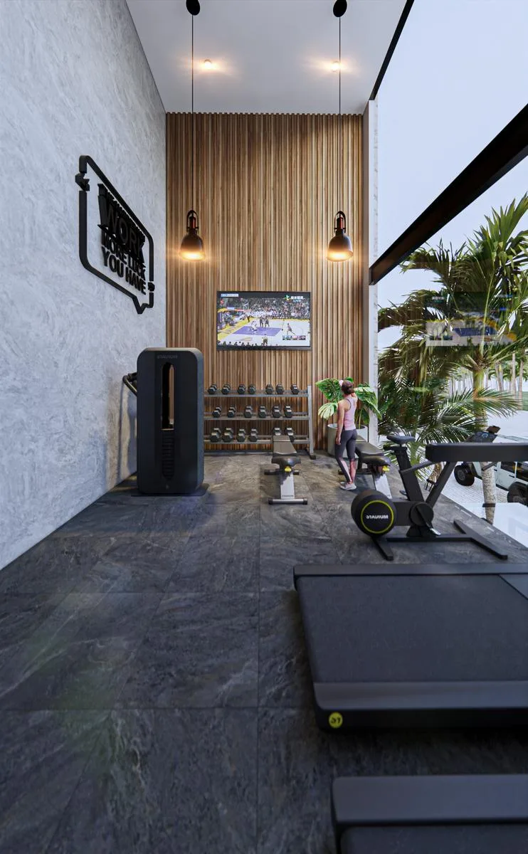 Residents have access to building amenities including a rooftop with swimming pools, a fully equipped gym, a coworking space, a play area, a spa, sun loungers, a fire pit, a sky bar, and an elevator. The building provides 24/7 security with CCTV surveillance.