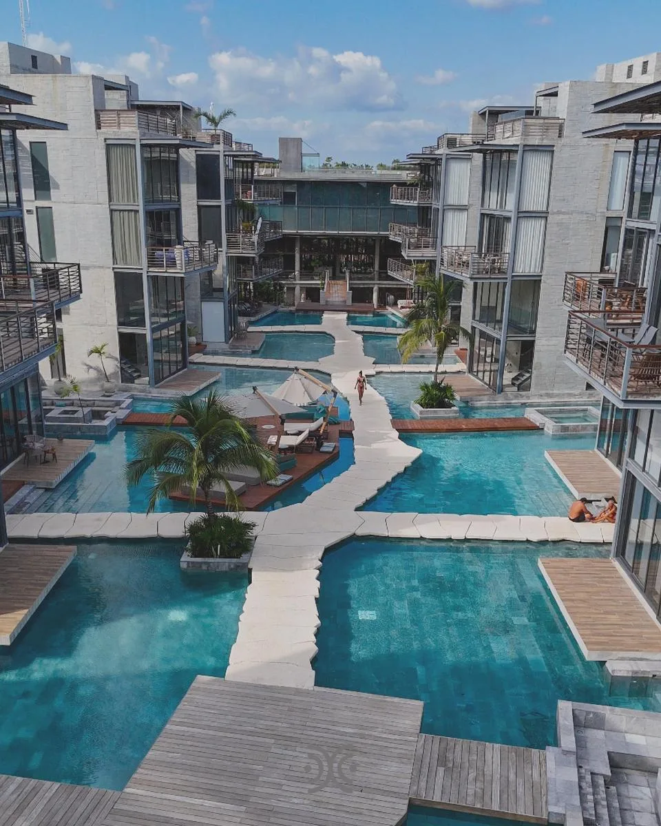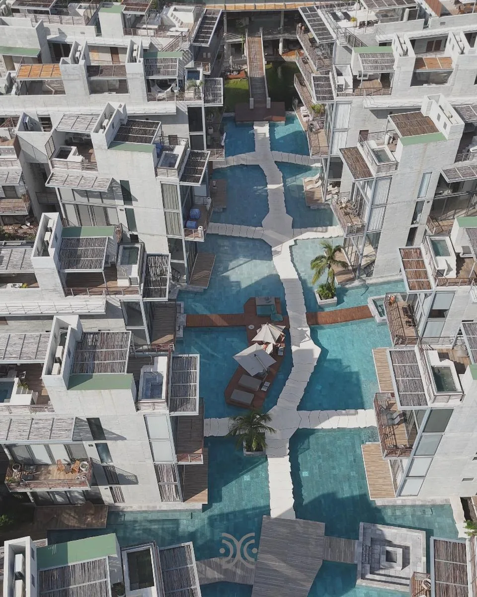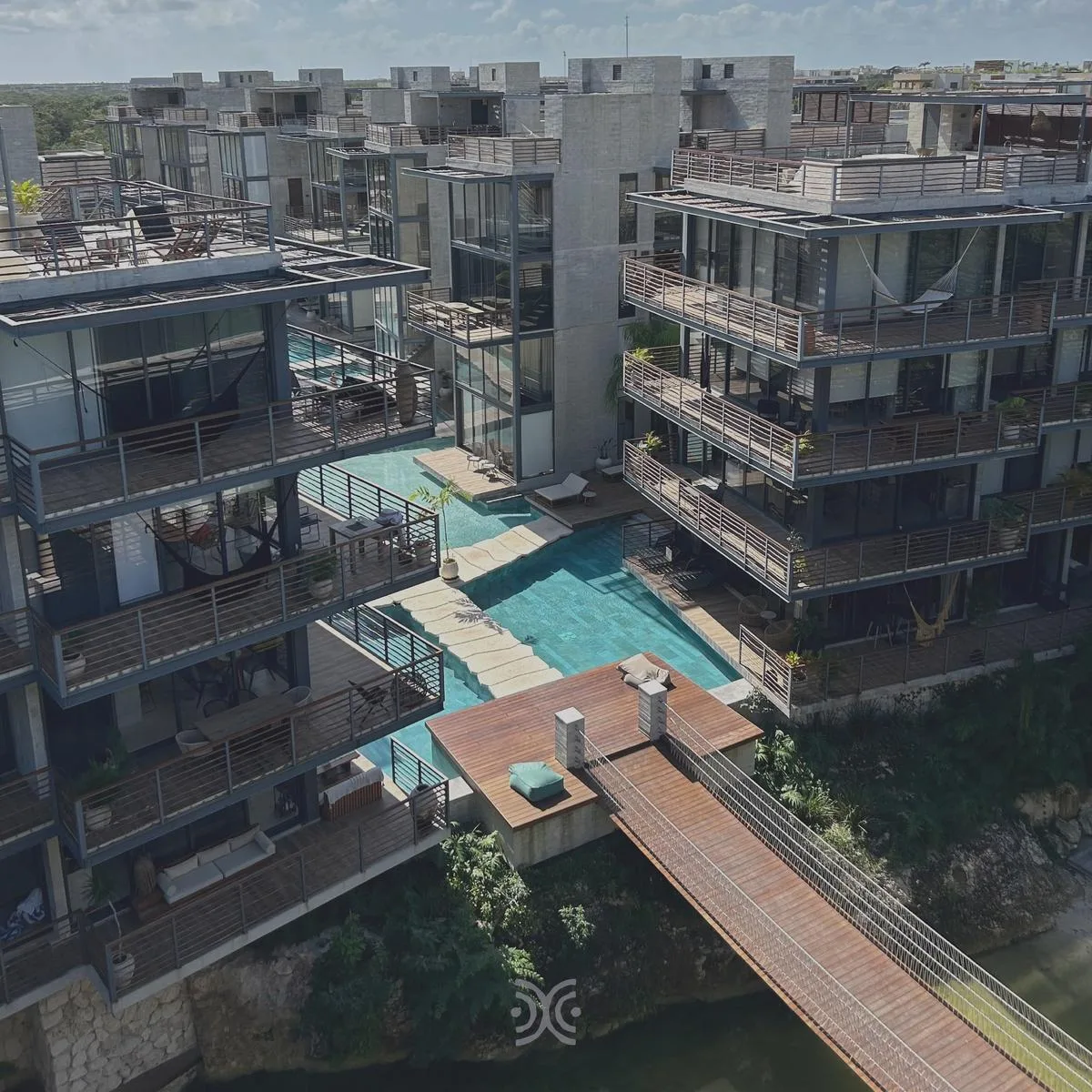 The residence features a private cenote, a central swimming pool and jacuzzis, a cabin area and hammock zone, green areas, terraces and fire pits, and a Spa Wellness Center. Additional amenities include a gym, a spinning salon, a zen garden and yoga space, a lounge bar and wine cellar, a reading room and cafe, and concierge service. The building provides parking and 24-hour security with controlled access.