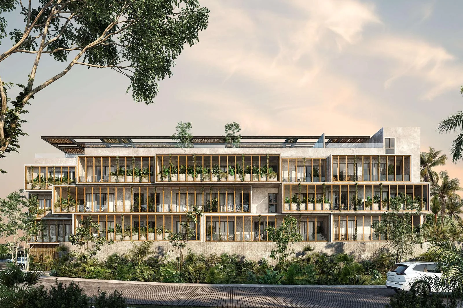 The architectural composition of the complex arises from a reinterpretation of the pre-Hispanic Mayan construction method, which utilizes a base with platforms on subsequent levels. This residential development consists of 51 apartments surrounded by nature.