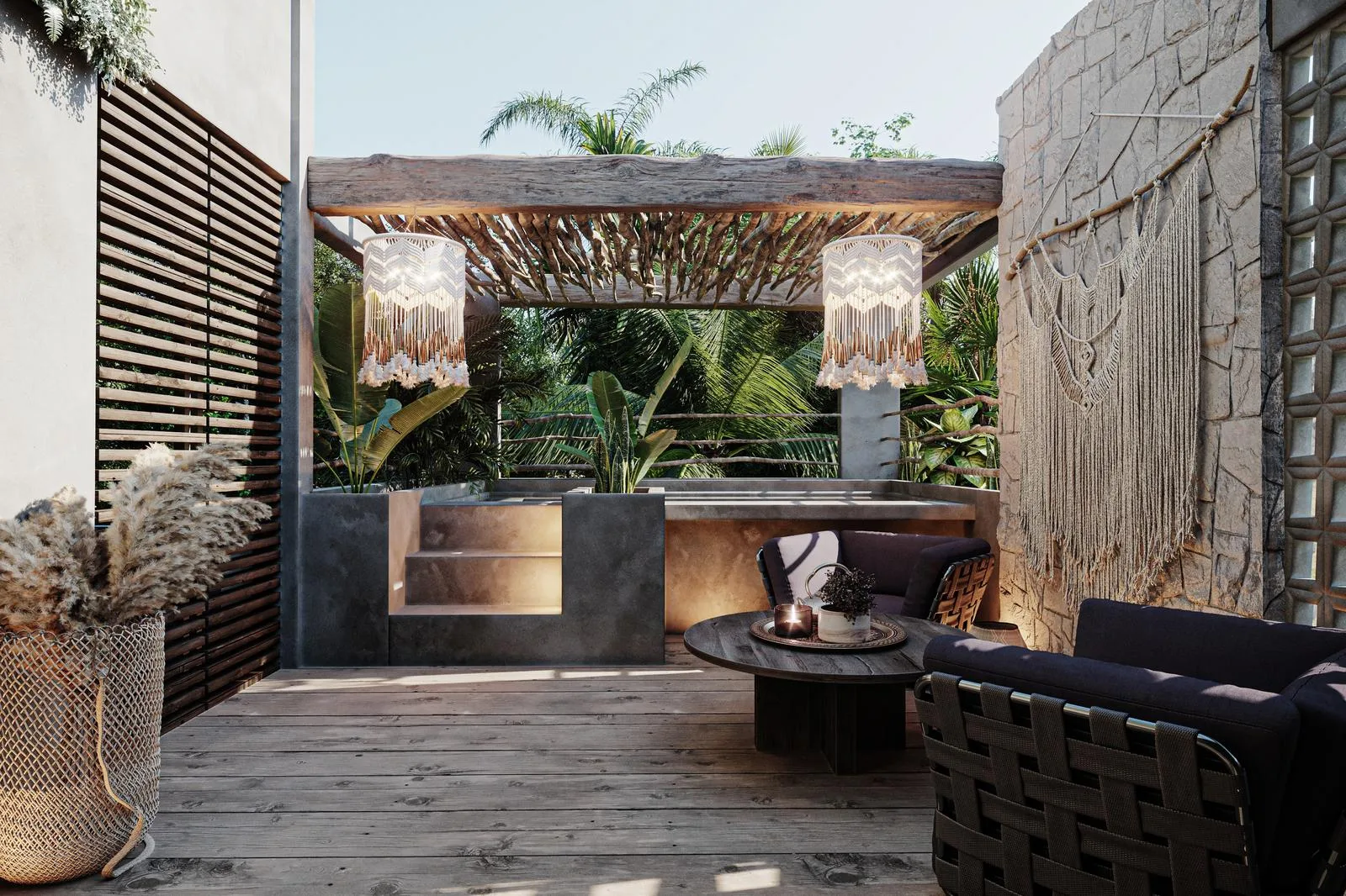 The residential complex provides a variety of amenities for relaxation and recreation, including a swimming pool and a jacuzzi. There is a sun deck for enjoying the sun and resting, along with an outdoor barbecue area ideal for social gatherings. Additional facilities include a dedicated yoga area and a bar zone.