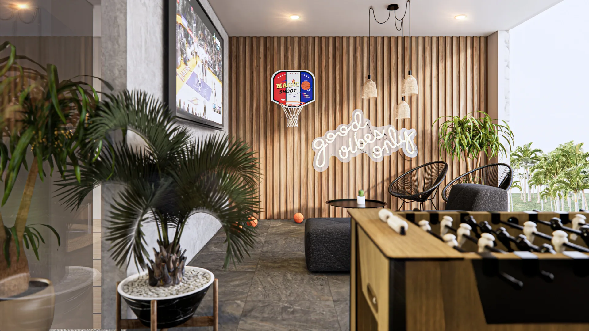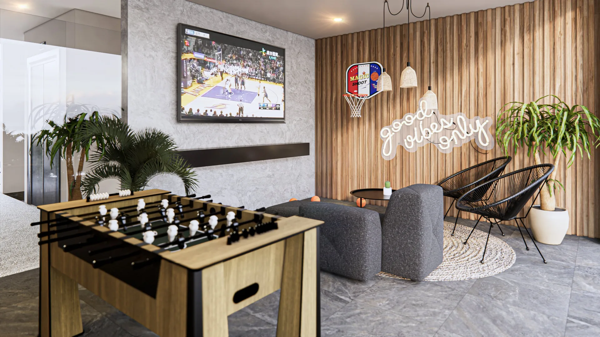 Residents have access to a rooftop with a pool, spa, solarium, games area, gym, sky bar, and fire pit. For comfort and convenience, the building includes a coworking area, elevators, controlled access, and 24-hour security.