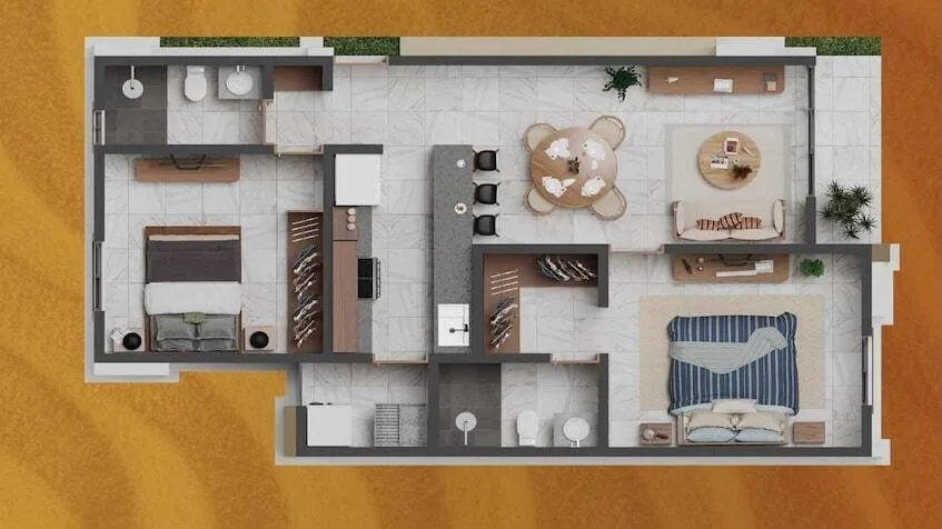 Thoughtfully designed residences maximize space and functionality, with options featuring 2 and 3 bedrooms. Two-bedroom residences include spacious bedrooms, an open-concept living and dining area, a fully equipped kitchen with a granite countertop, full bathrooms, a balcony or terrace, and a service area.