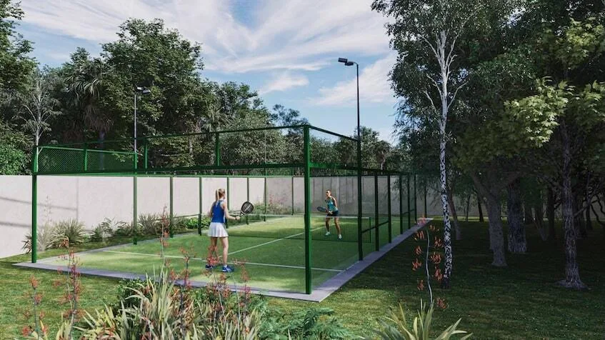 The property features extensive amenities integrated into expansive green areas with walking trails. These include a cenote-style swimming pool, a paddle court, a pickleball court, a family palapa, a zen zone, a pet park, and a grill area. The community offers controlled access and 24/7 security.