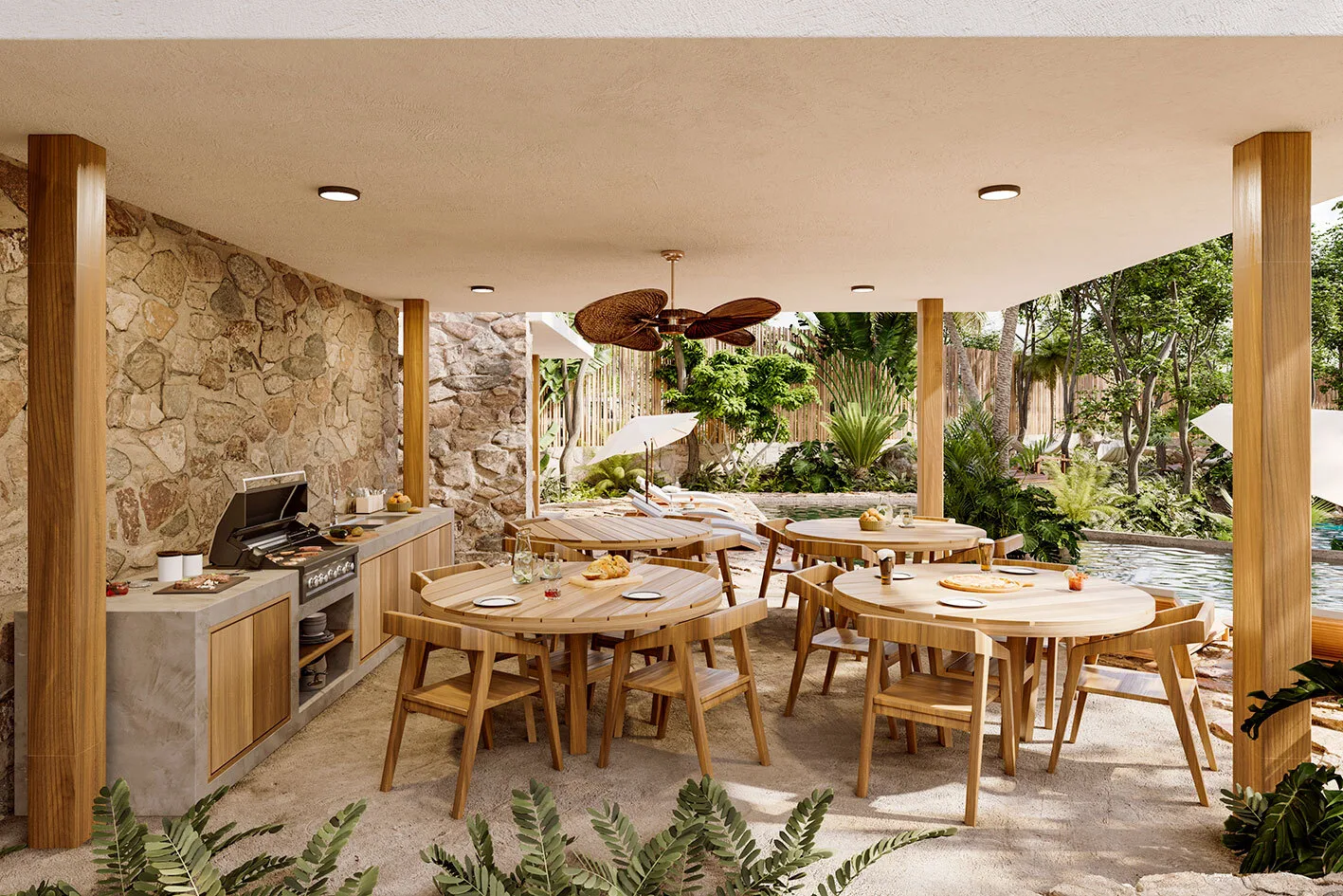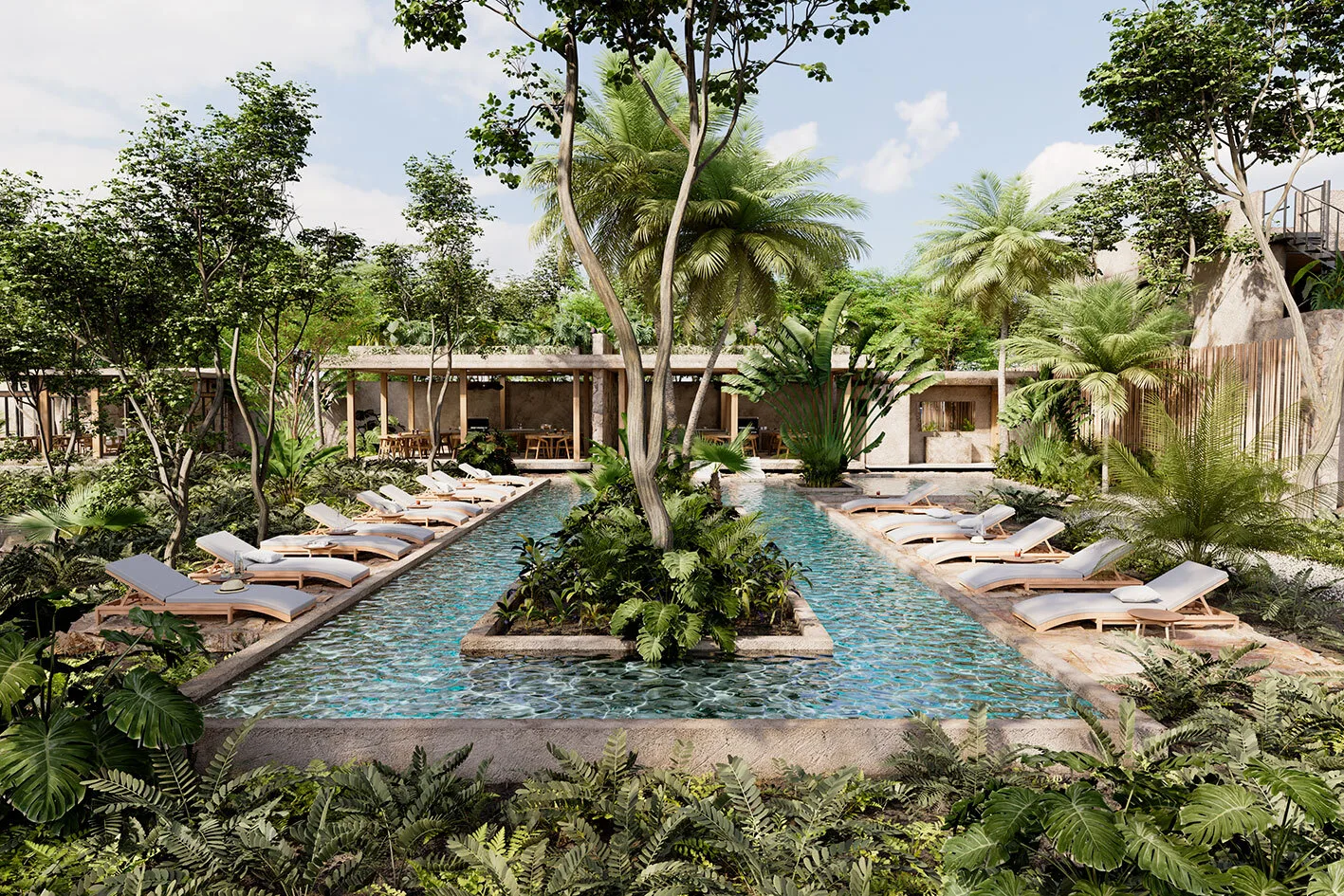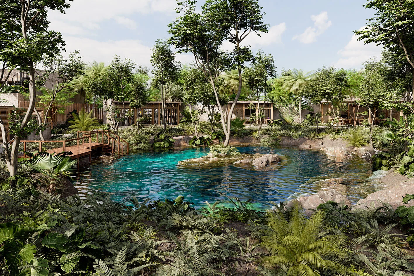 Discover a thoughtfully planned community in Tulum where cenotes and green spaces are central features. The design is inspired by ancestral traditions and integrates with the natural jungle environment, promoting calm walks and outdoor activities.