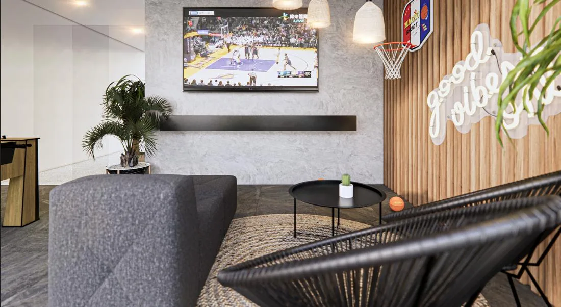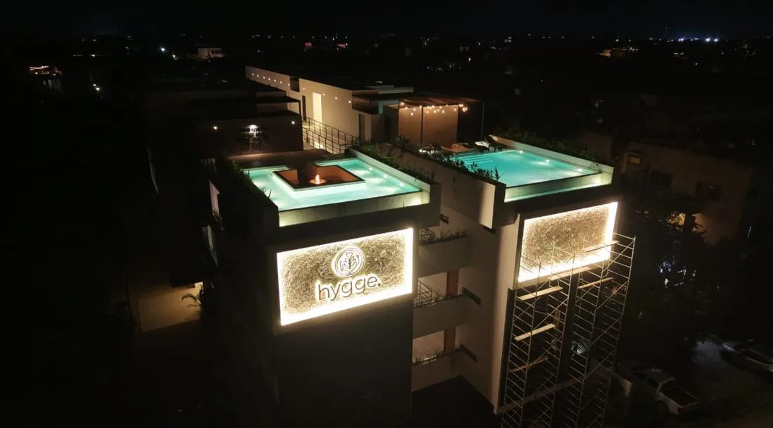 The residence offers access to a gym, a coworking area, a rooftop with a swimming pool, a spa, sunbeds, a game room, a fire pit, and a sky bar.