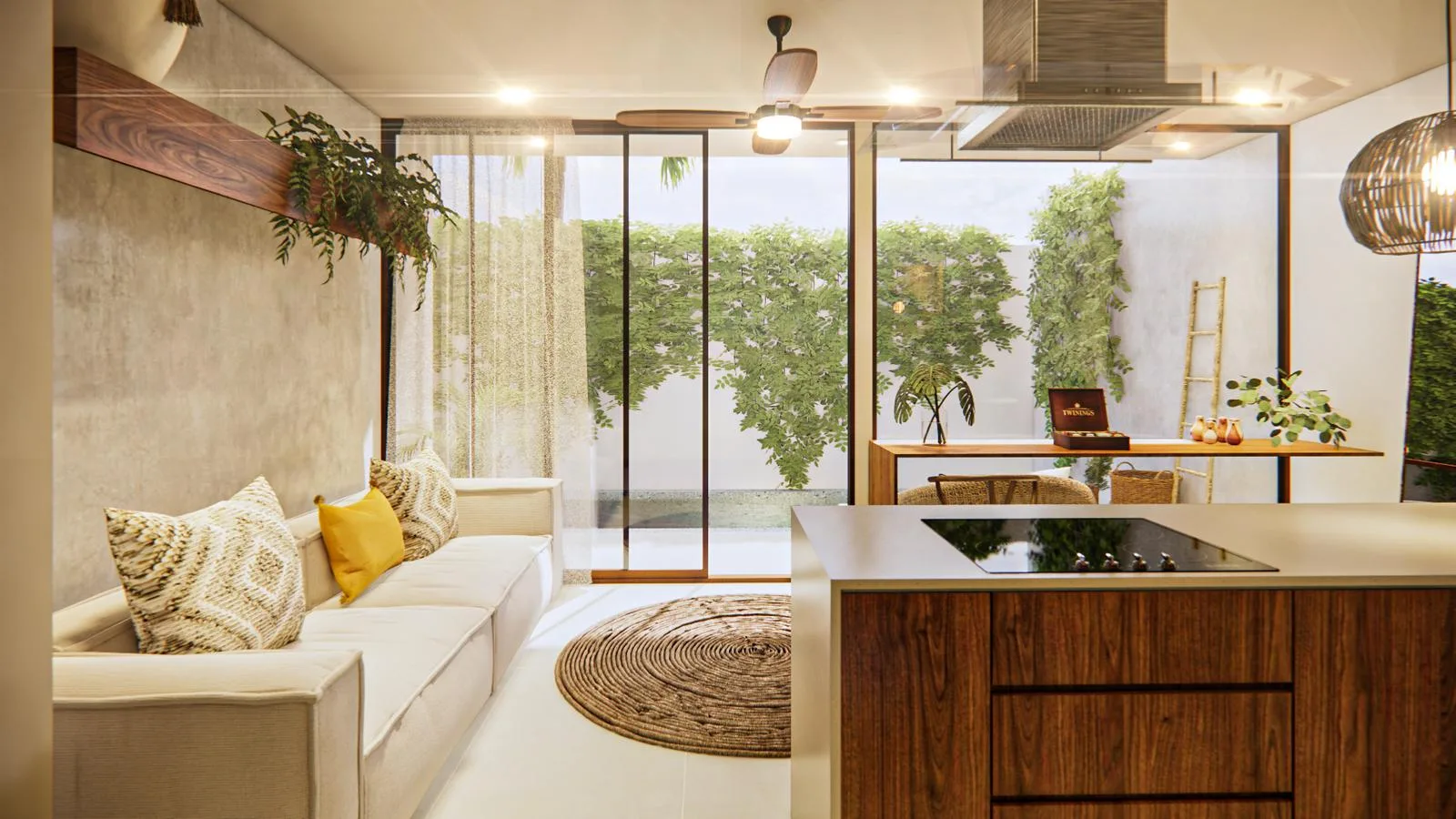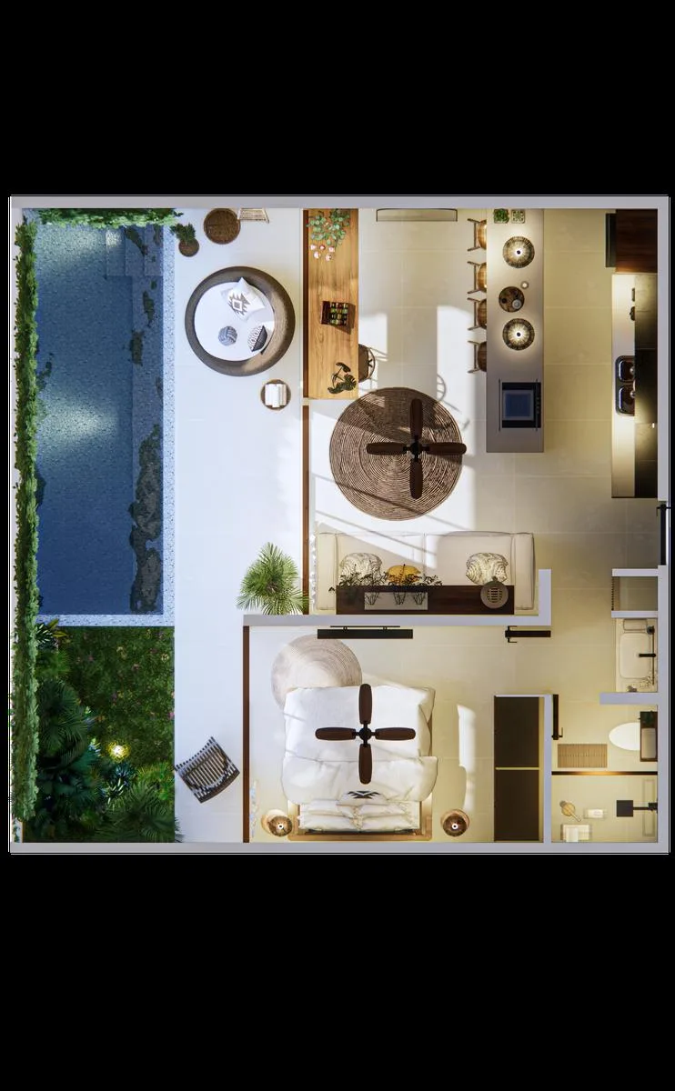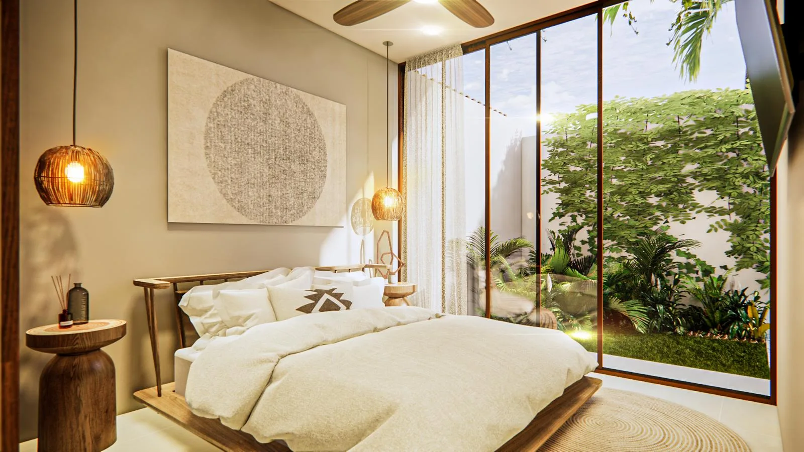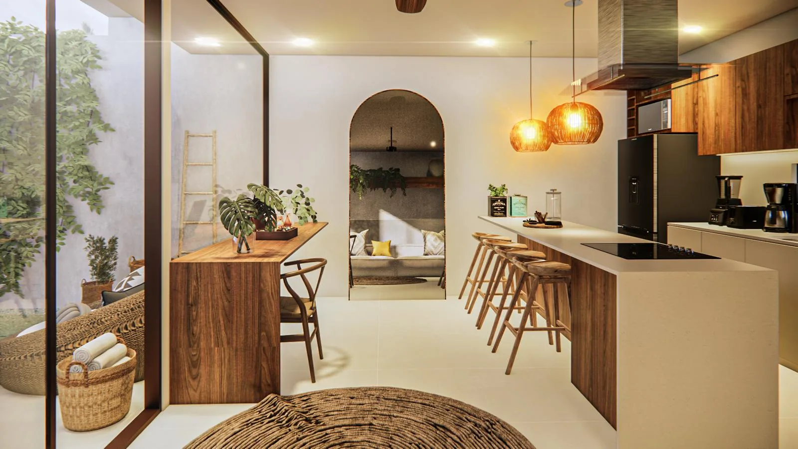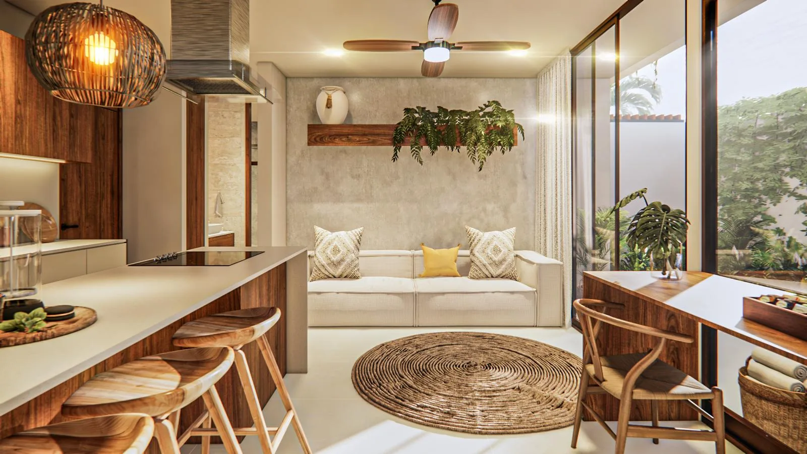This cozy one-bedroom, one-bathroom apartment offers a unique living experience within a modern environment set in nature. It is situated in a high-growth area of the Riviera Maya.