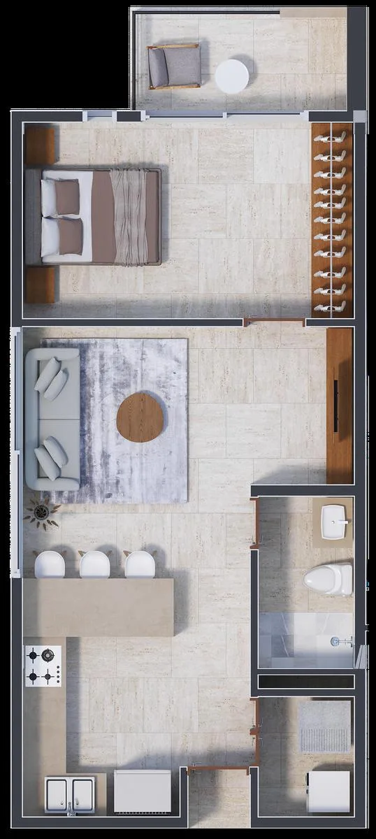 The one-bedroom model offers 57. 37 square meters total, with one bedroom, an integrated kitchen, a living room, a full bathroom, a laundry area, and a terrace.