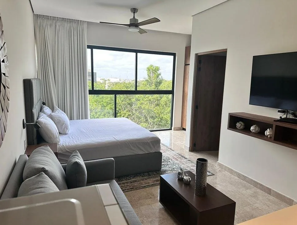 This 50-square-meter loft in Giaga Towers, Tulum, is fully furnished and equipped. It features a kitchenette, a king-size bed, and a living area with a television, all within a single open space without divisions.