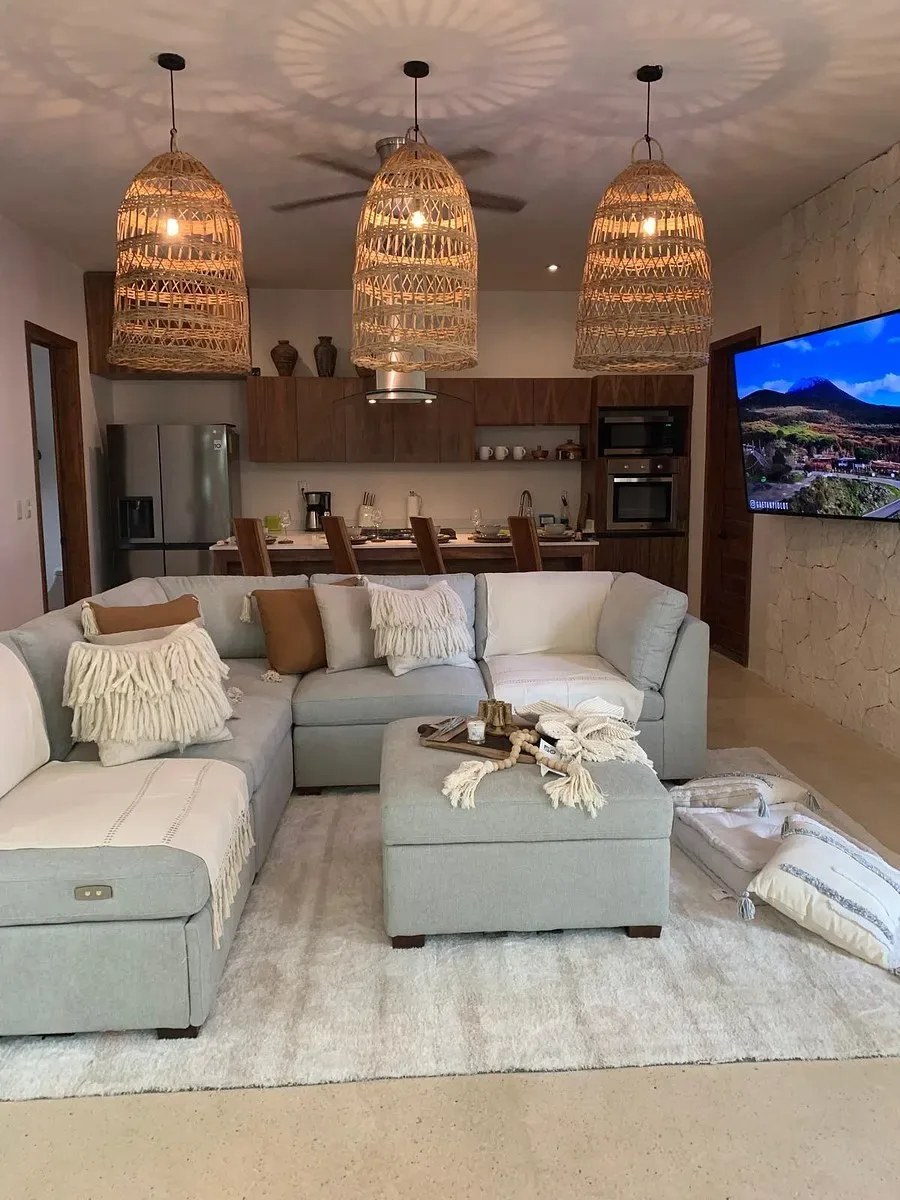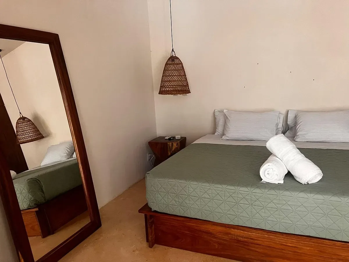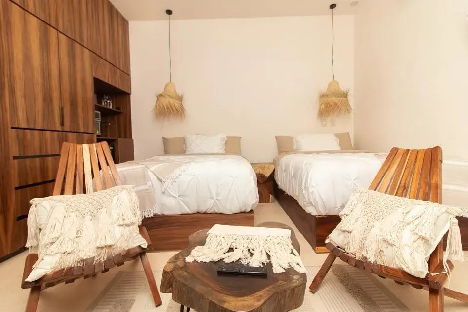This residential unit is located in Tulum, Quintana Roo. It features 2 lock-off bedrooms, 2 full bathrooms, 1 half bathroom, and an open living area that combines the kitchen, living room, and laundry room.