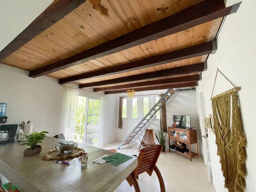 The second tower comprises two apartments. One is a two-story apartment with two bedrooms, 2. 5 bathrooms, a kitchen, and two terraces. The other is a one-bedroom apartment with one bathroom, a kitchen, a terrace, and a rooftop palapa. This tower also has covered parking for two cars.