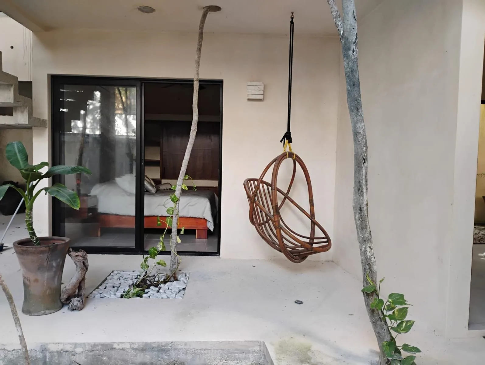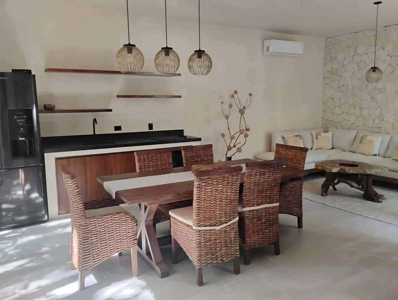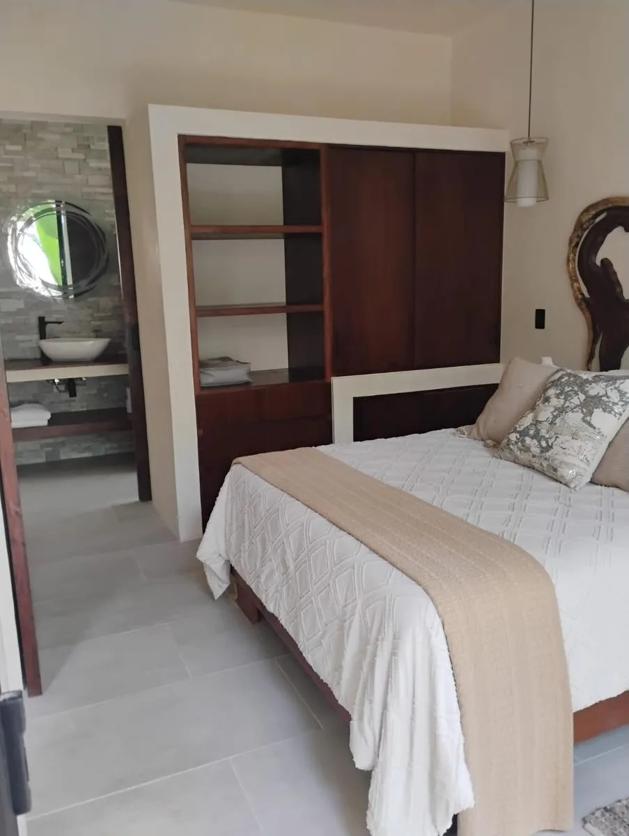 This one-bedroom apartment is located in the Zazil-ha area of Tulum. The unit features one bedroom, one full bathroom, and a private terrace overlooking green areas. The kitchen is equipped, and the apartment includes closets and air conditioning.