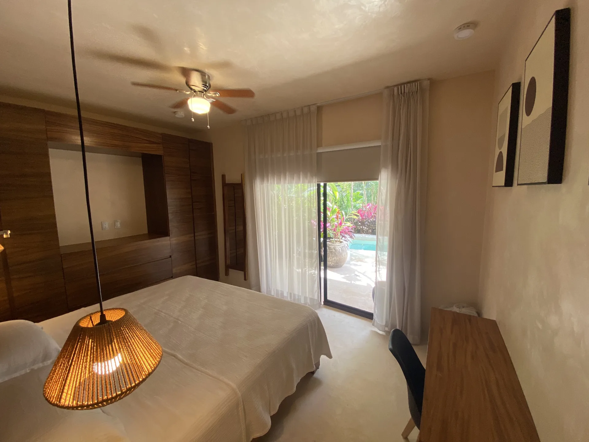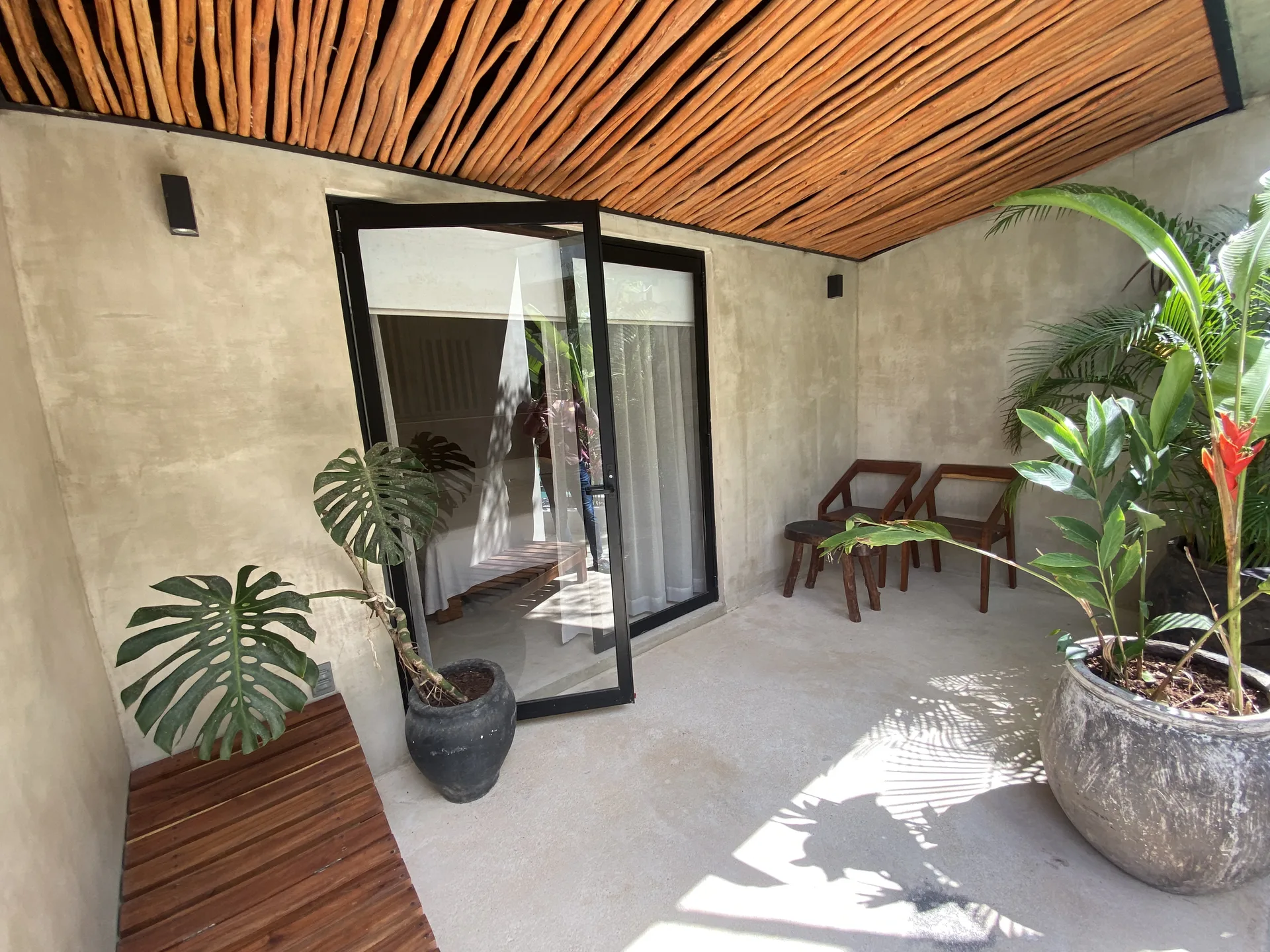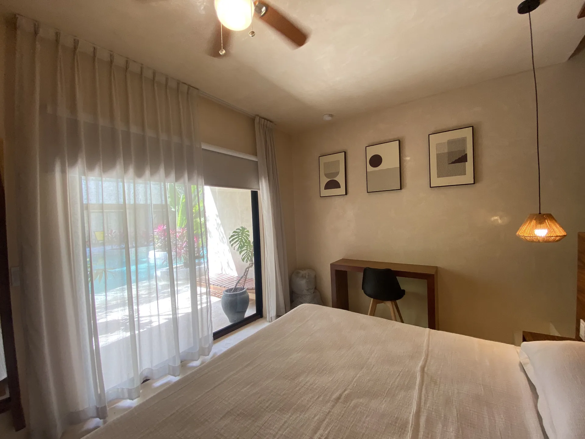 This one-bedroom apartment is fully furnished and features a unique poolside design. It is located within the Areia Phase 2 development in Tulum.