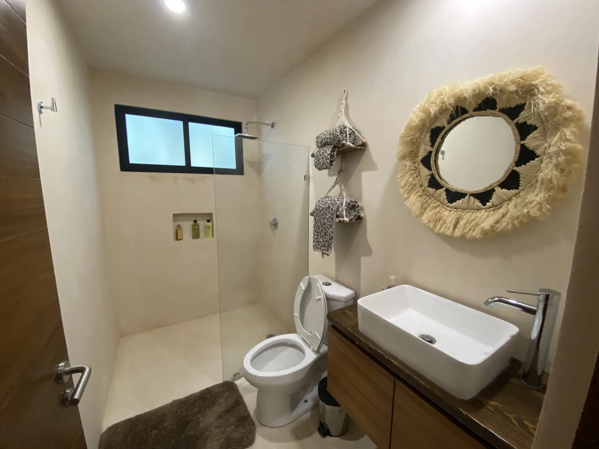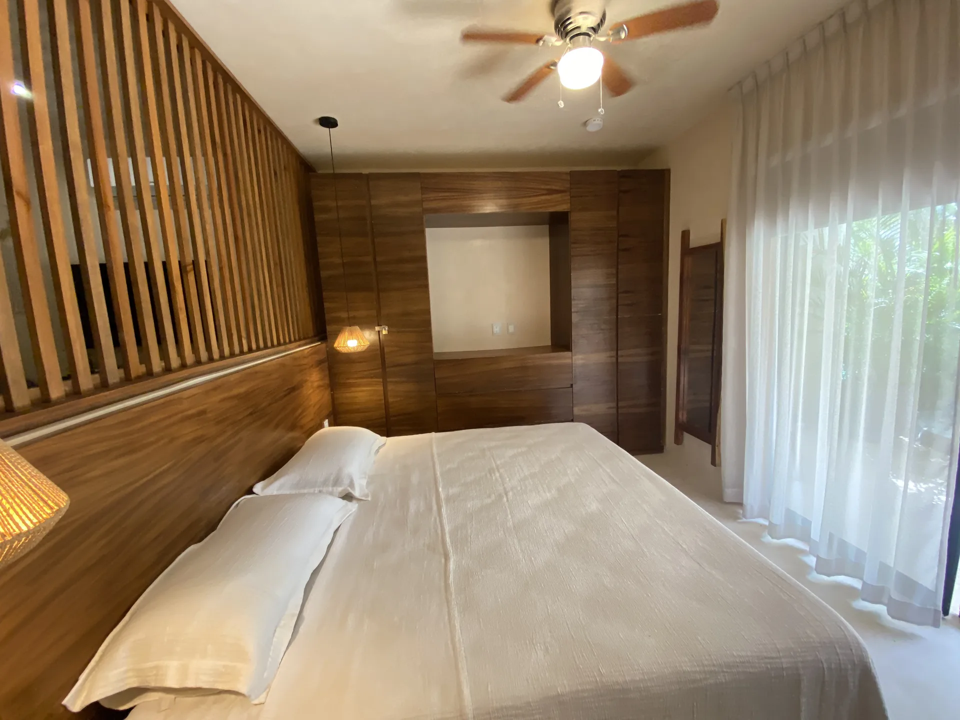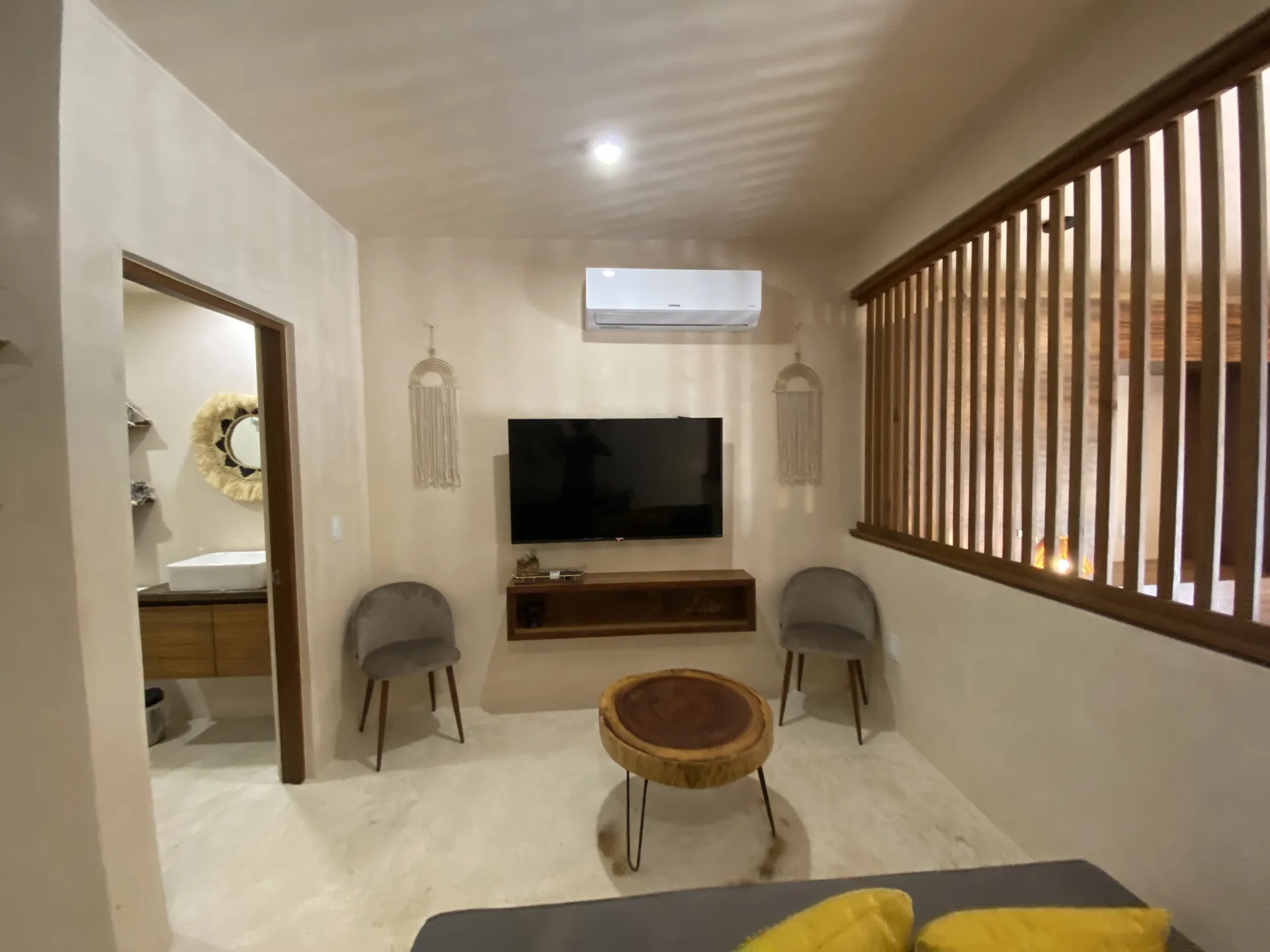 This one-bedroom apartment is fully furnished and features a unique poolside design. It is located within the Areia Phase 2 development in Tulum.