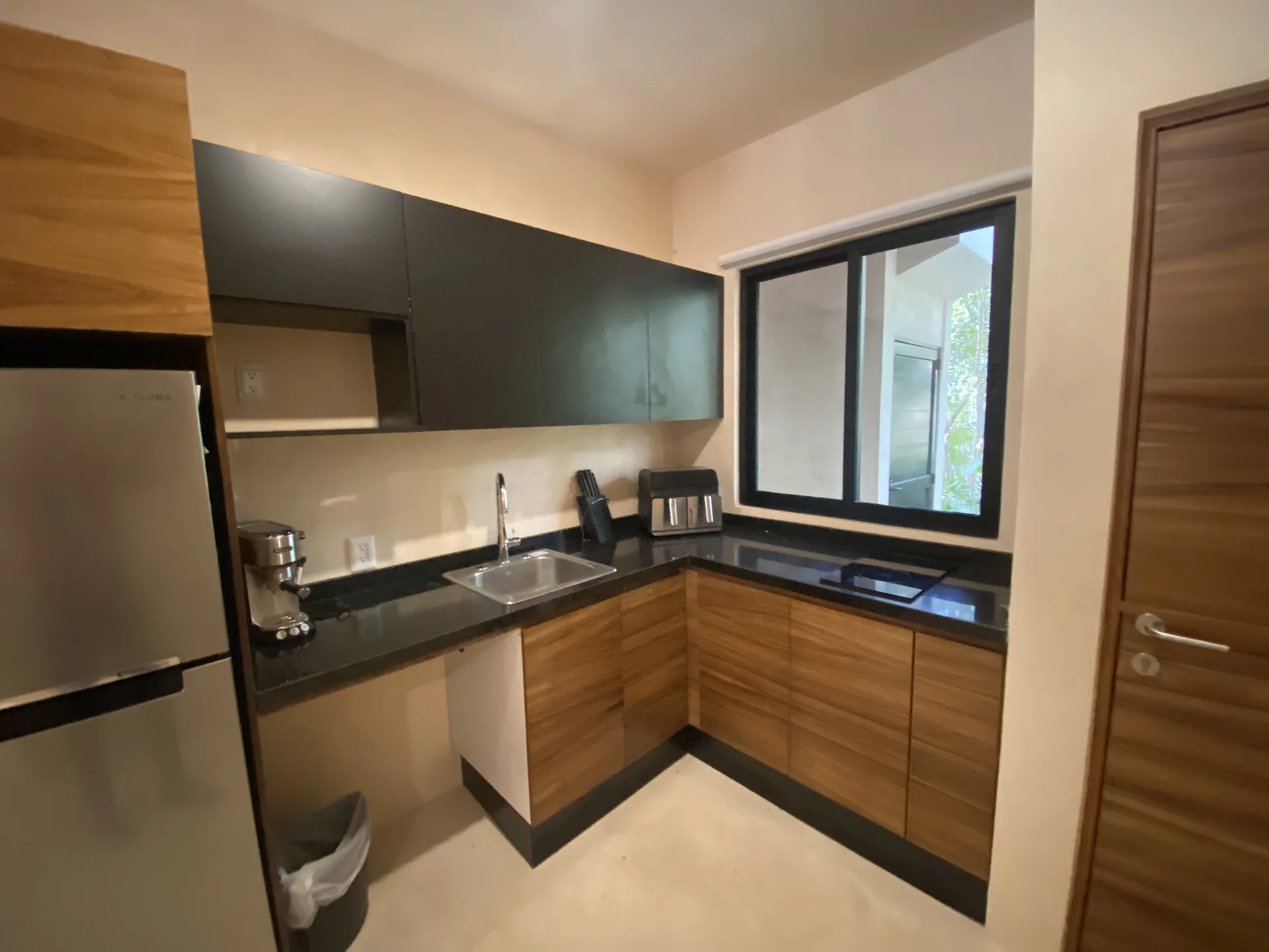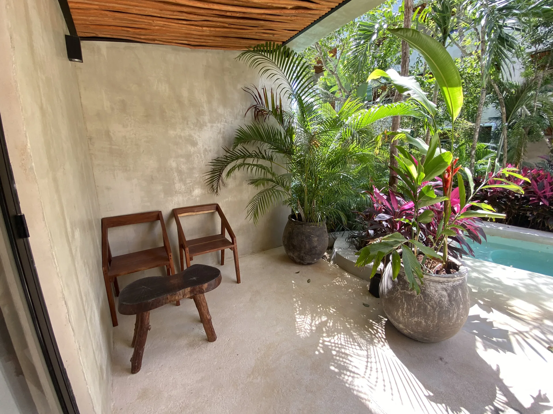This one-bedroom unit is delivered fully furnished and equipped with a stove, refrigerator, ceiling fan, air conditioning, and closets. It features an incredible design with a private pool terrace that offers a private space adjacent to the main pool. The unit includes finishes in chukum and parota, both regional materials known for their durability and distinctive Tulum style.