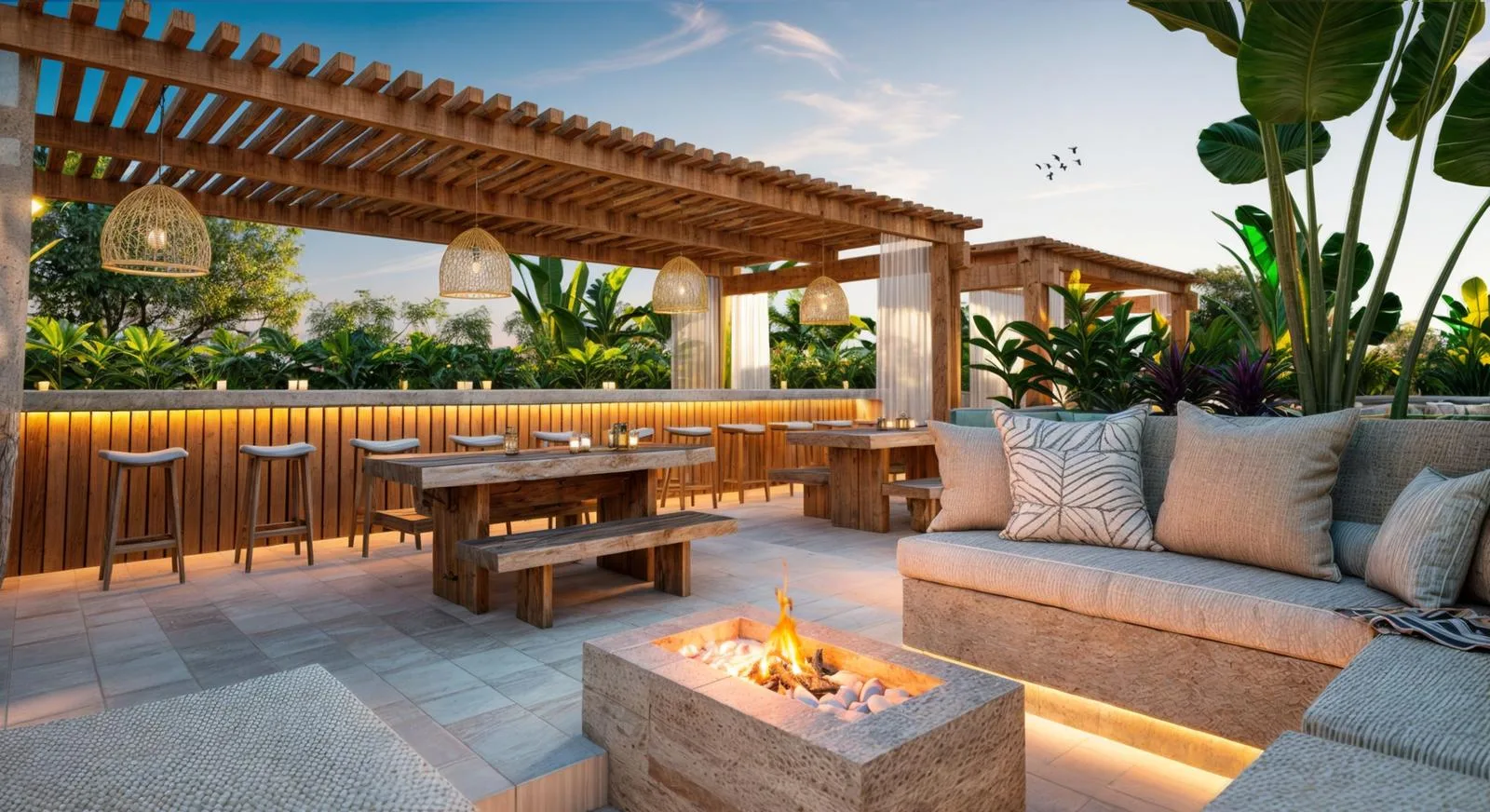 The development features an infinity pool, a jacuzzi with sea views, and a sunbathing area on the rooftop. The rooftop also includes a sky bar, a grill, and a lounge area with fire pits. A separate pool is located on the ground floor.