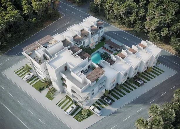 The building offers a common swimming pool and lounge area with sunbeds. An outdoor palapa and other designed spaces provide areas to enjoy the outdoors.