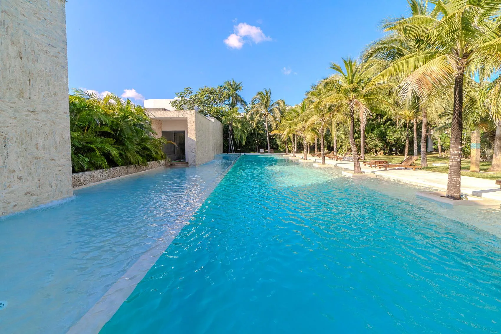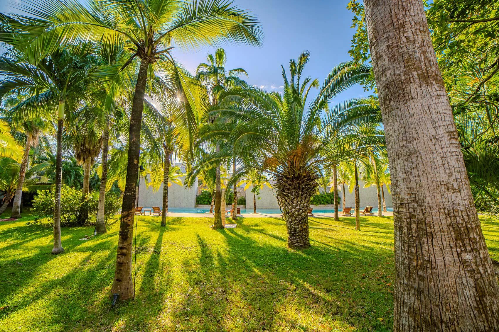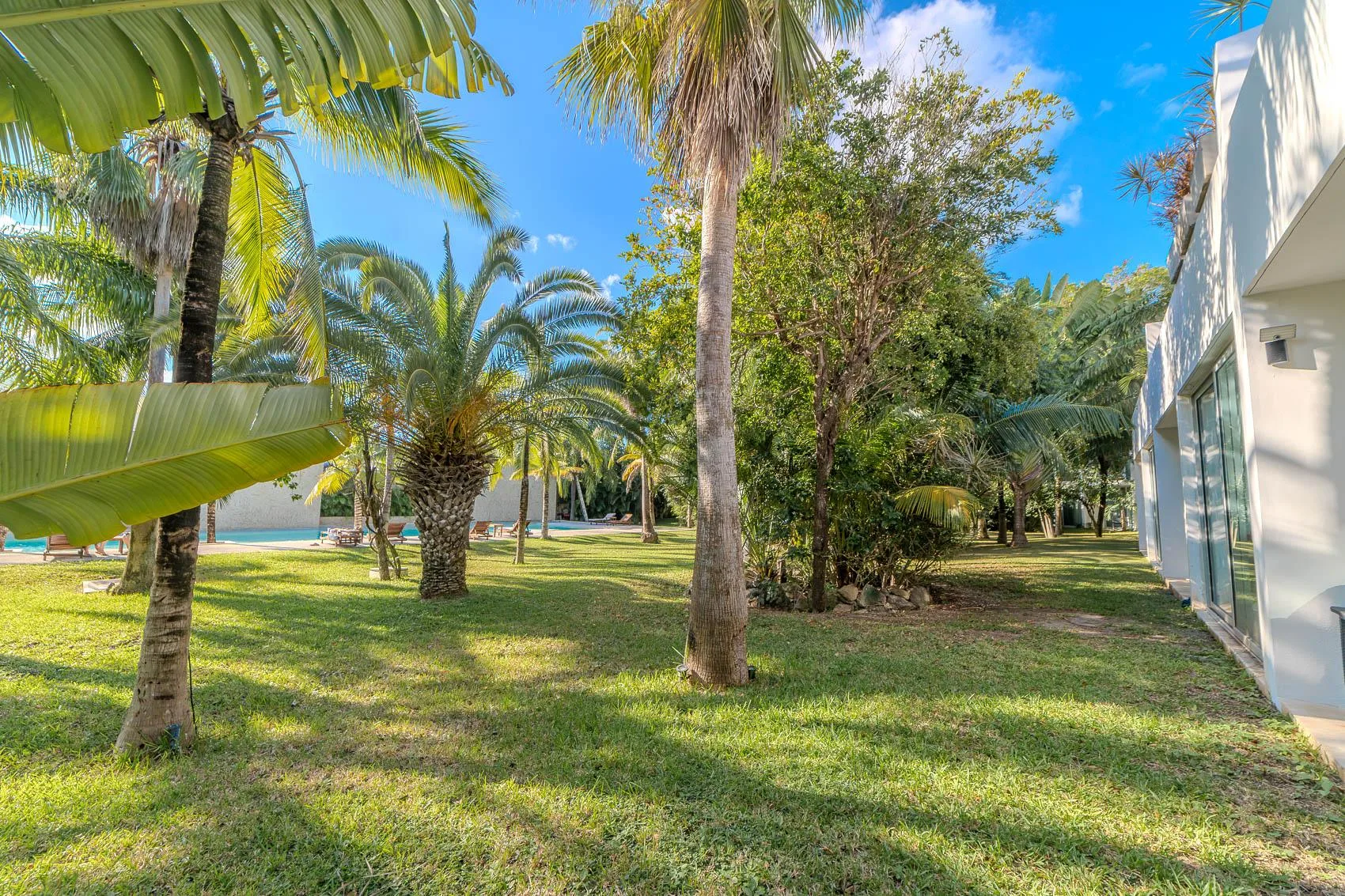 The terrace is substantial and faces a large garden with grass and palm trees. The property includes a swimming pool with a designated lane for swimming and a separate area for children. The pool area is equipped with lounge chairs and outdoor showers.