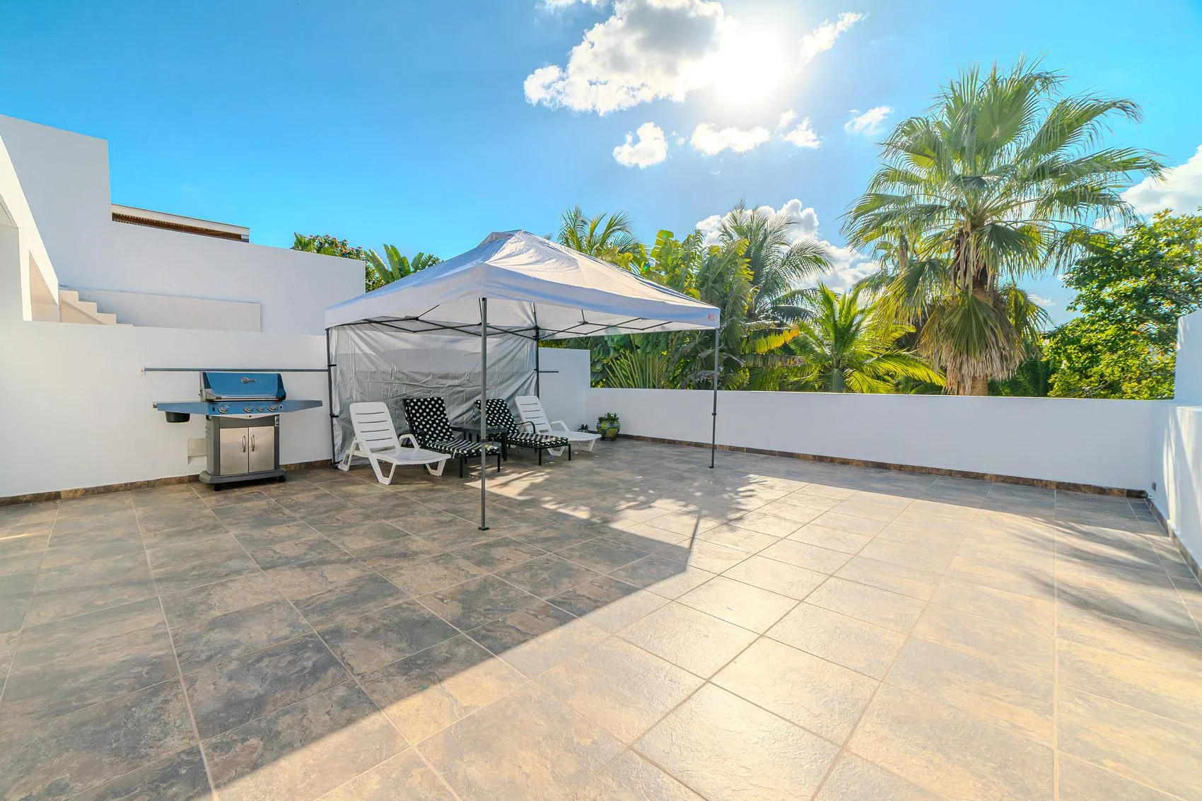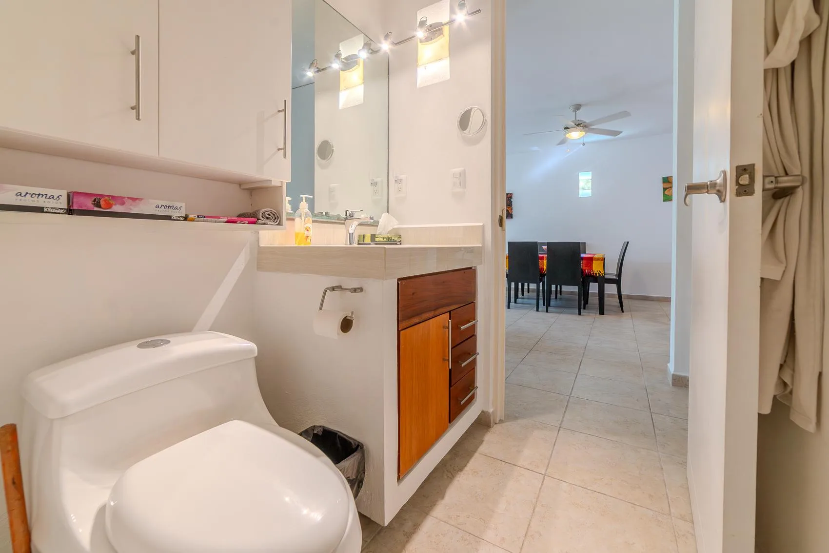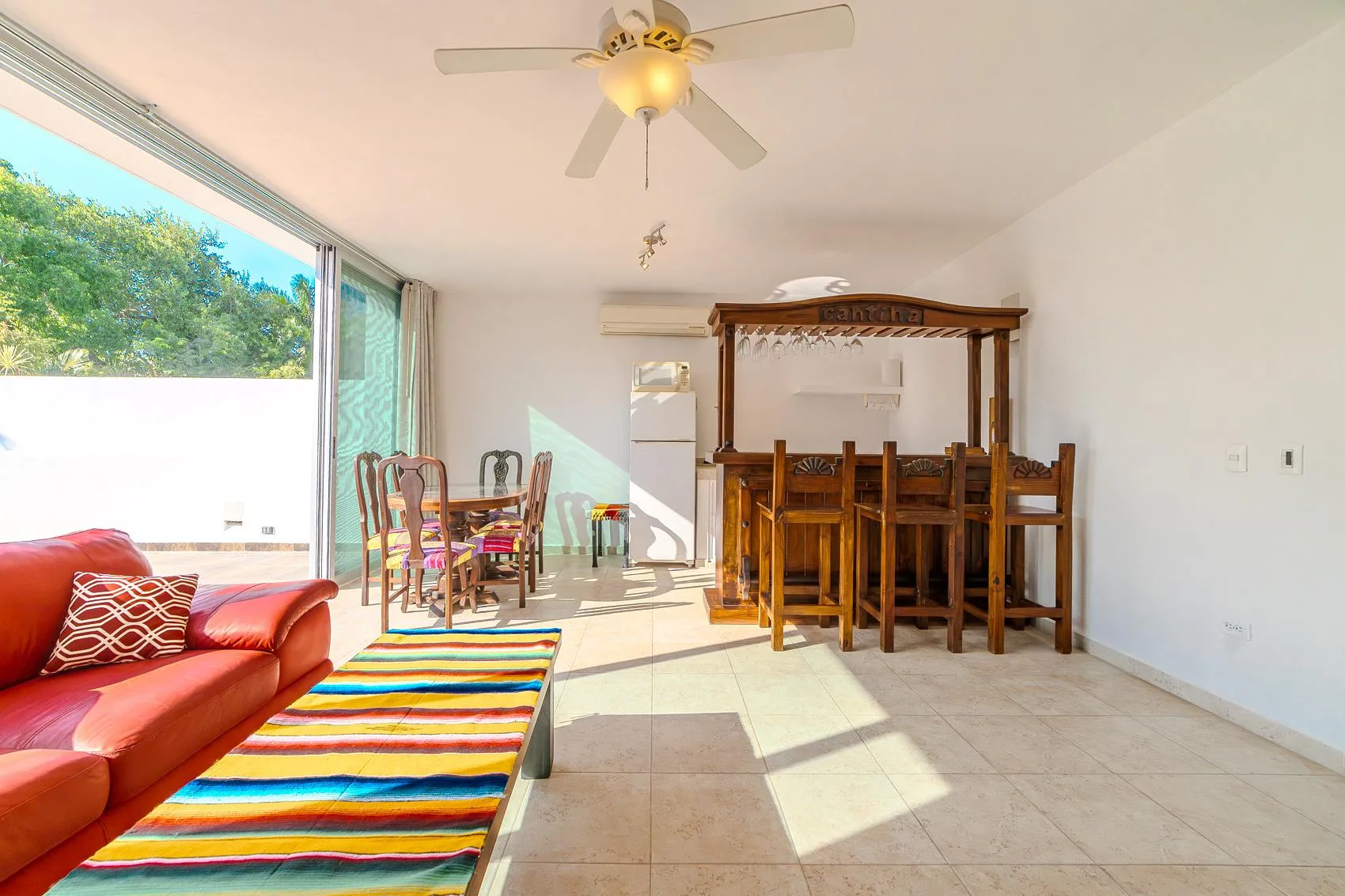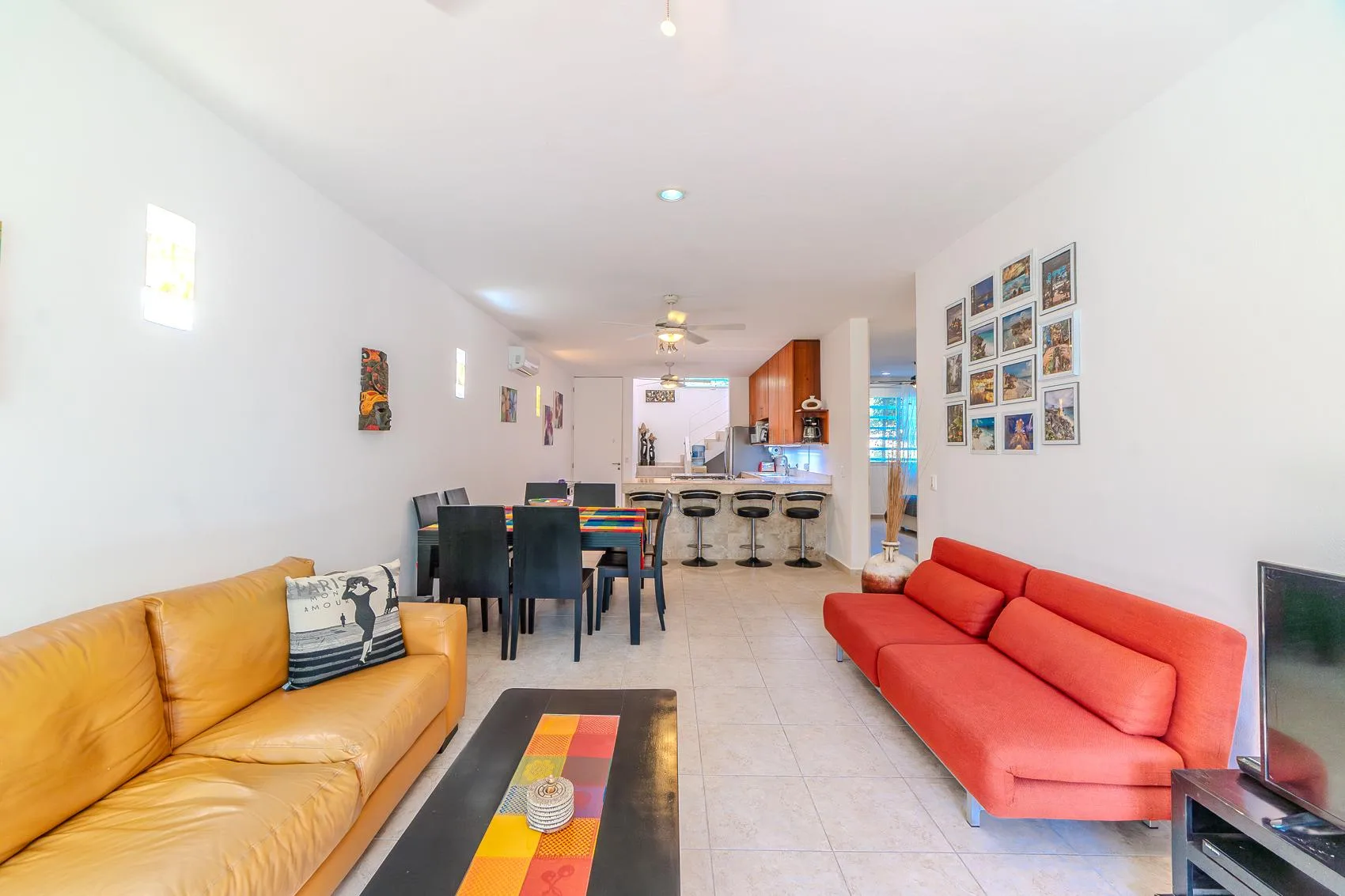 This spacious condo is situated in the heart of Tulum Downtown, on La Selva Avenue near the gypsy market, within the White Condo condominium. It is a two-story property.