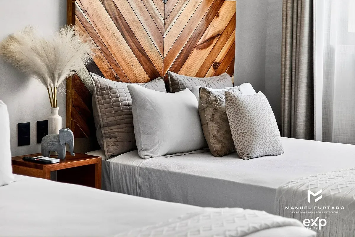 This condominium features a well-designed living space of 121. 21 square meters configured as a lock-off unit. It is fully furnished and includes three bedrooms, with beds configured as two queens and two kings, and three and a half bathrooms. A private Jacuzzi is located on the terrace.