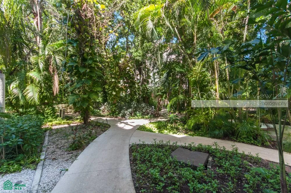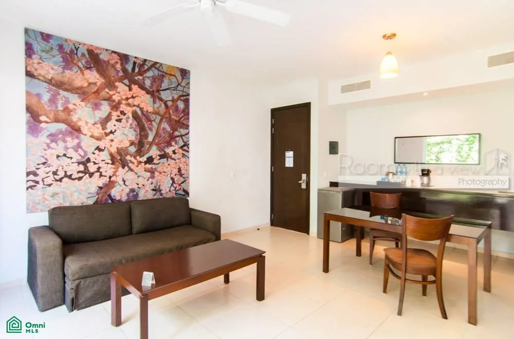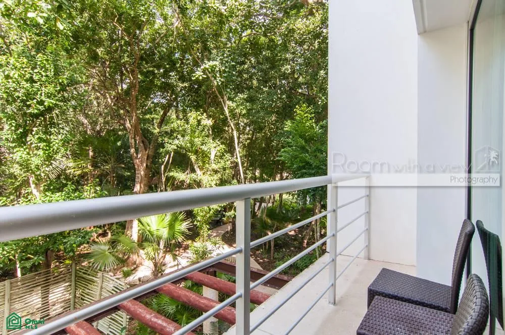 This studio-style condo offers inviting indoor-outdoor spaces within a secure, gated resort community. The unit features a spacious open layout with a kitchenette, a sun-filled living and dining area, and a separate sleeping area with ample closet space. The living area opens to a private balcony with jungle views.