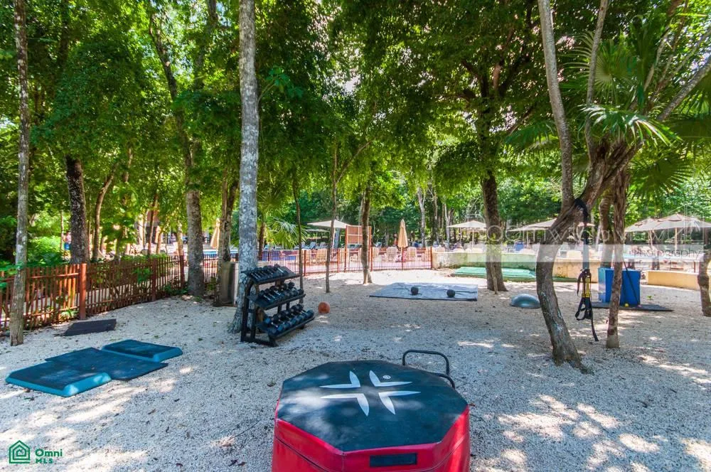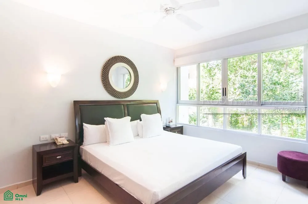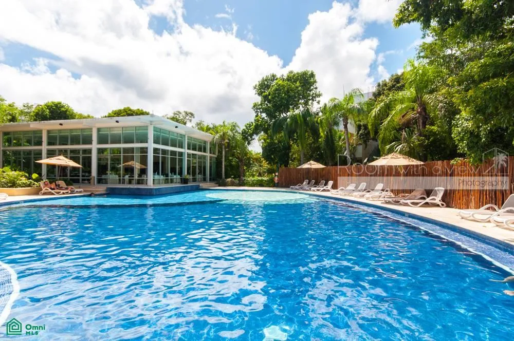 The condominium complex is surrounded by a PGA golf course and is located just minutes from the Caribbean coast. The property includes access to a community pool, a clubhouse, tennis courts, and extensive green areas. The community features a front desk, private roads, and 24-hour security.