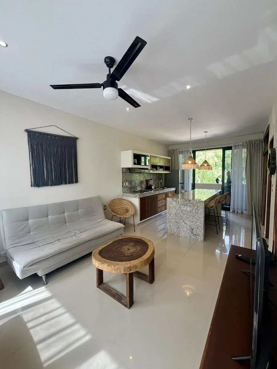 The apartment features one bedroom, one full bathroom, a spacious living room, an integrated dining area, a modern kitchen, and a laundry area. It encompasses 55. 50 square meters and includes high-quality finishes, air conditioning, and considerate details. The unit is fully equipped and furnished, ready for occupancy. Its design emphasizes ecological integration with the surrounding jungle, promoting sustainable living.