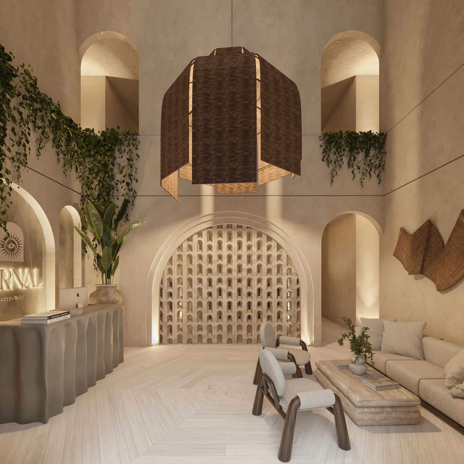 The architectural design masterfully combines tradition and modernity. Arches of various forms and proportions create sculptural volumes and an organic play of light and shadow. Green areas flow between the spaces to provide an atmosphere of natural harmony.