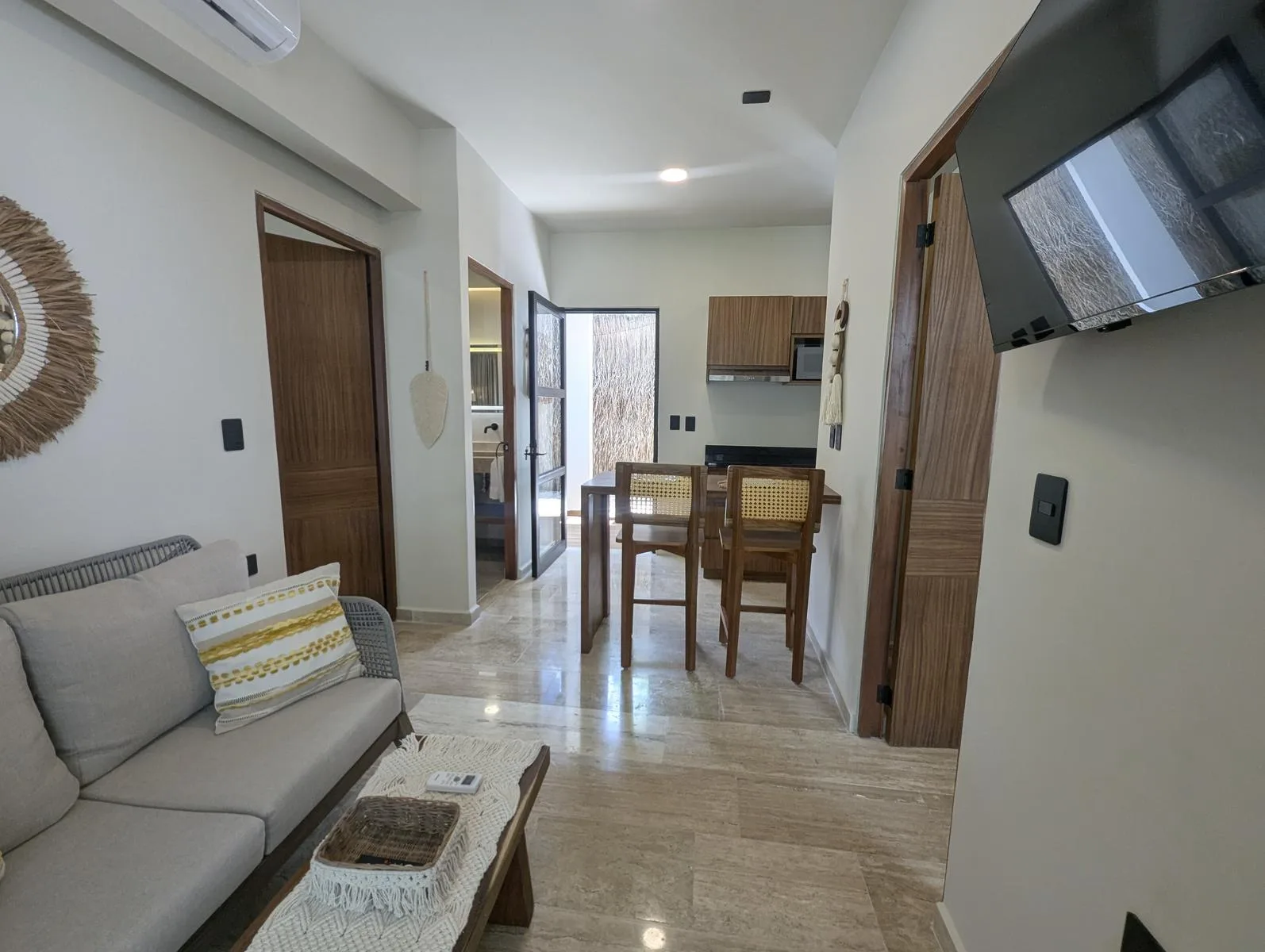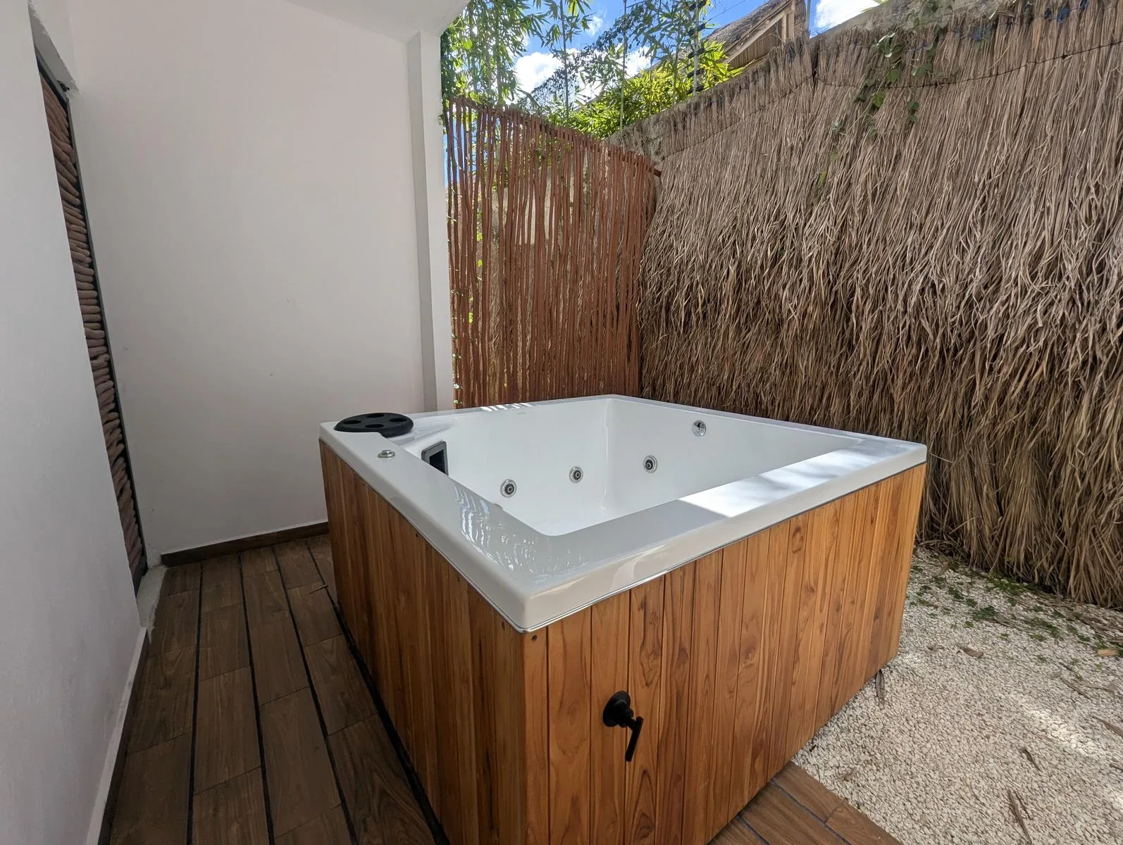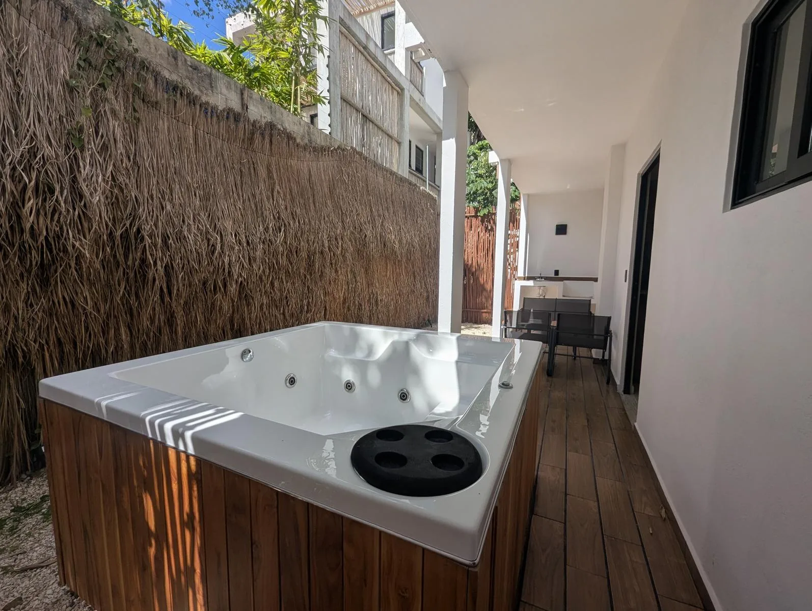 The interior includes an equipped kitchen, a bar and dining area, and a living room with space for a television. The unit offers a private mini garden and a private Jacuzzi for outdoor relaxation.