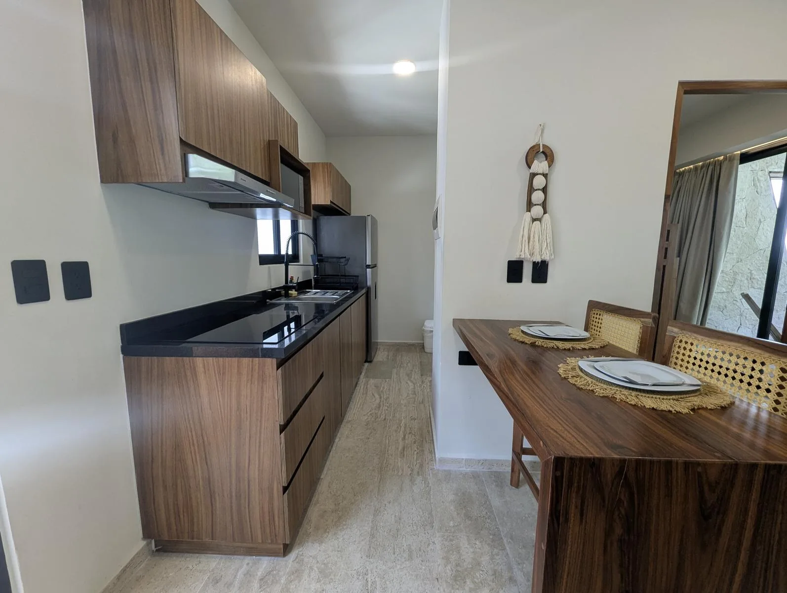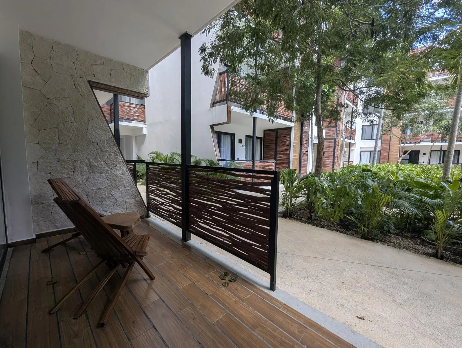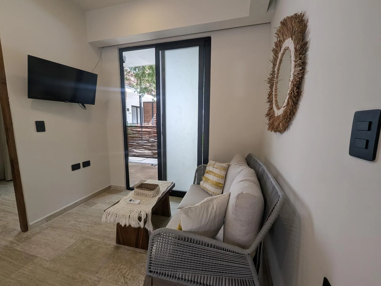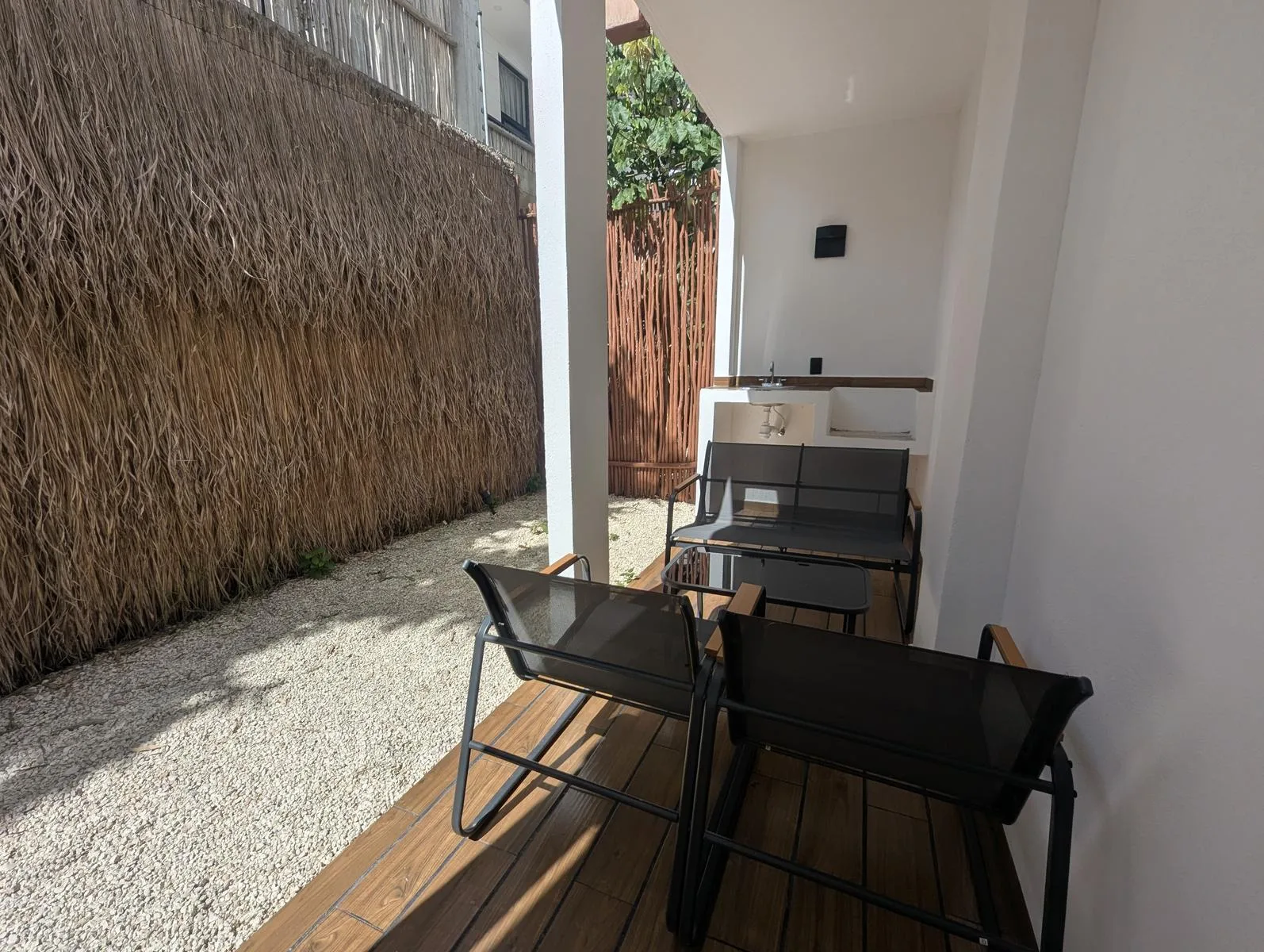 The interior includes an equipped kitchen, a bar and dining area, and a living room with space for a television. The unit offers a private mini garden and a private Jacuzzi for outdoor relaxation.