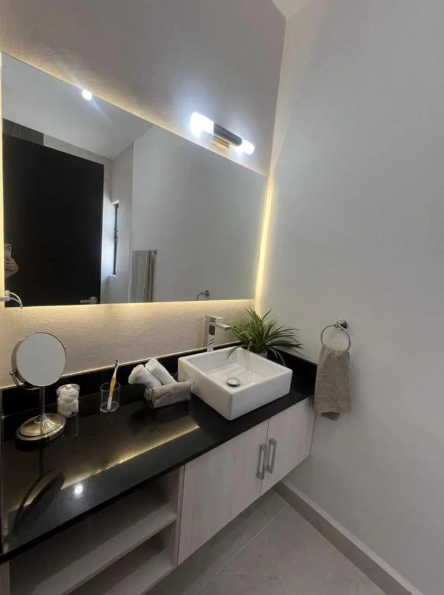 The home is located on Huayacán Avenue in Cancun, with access to the Maya Train and proximity to Cancun International Airport.