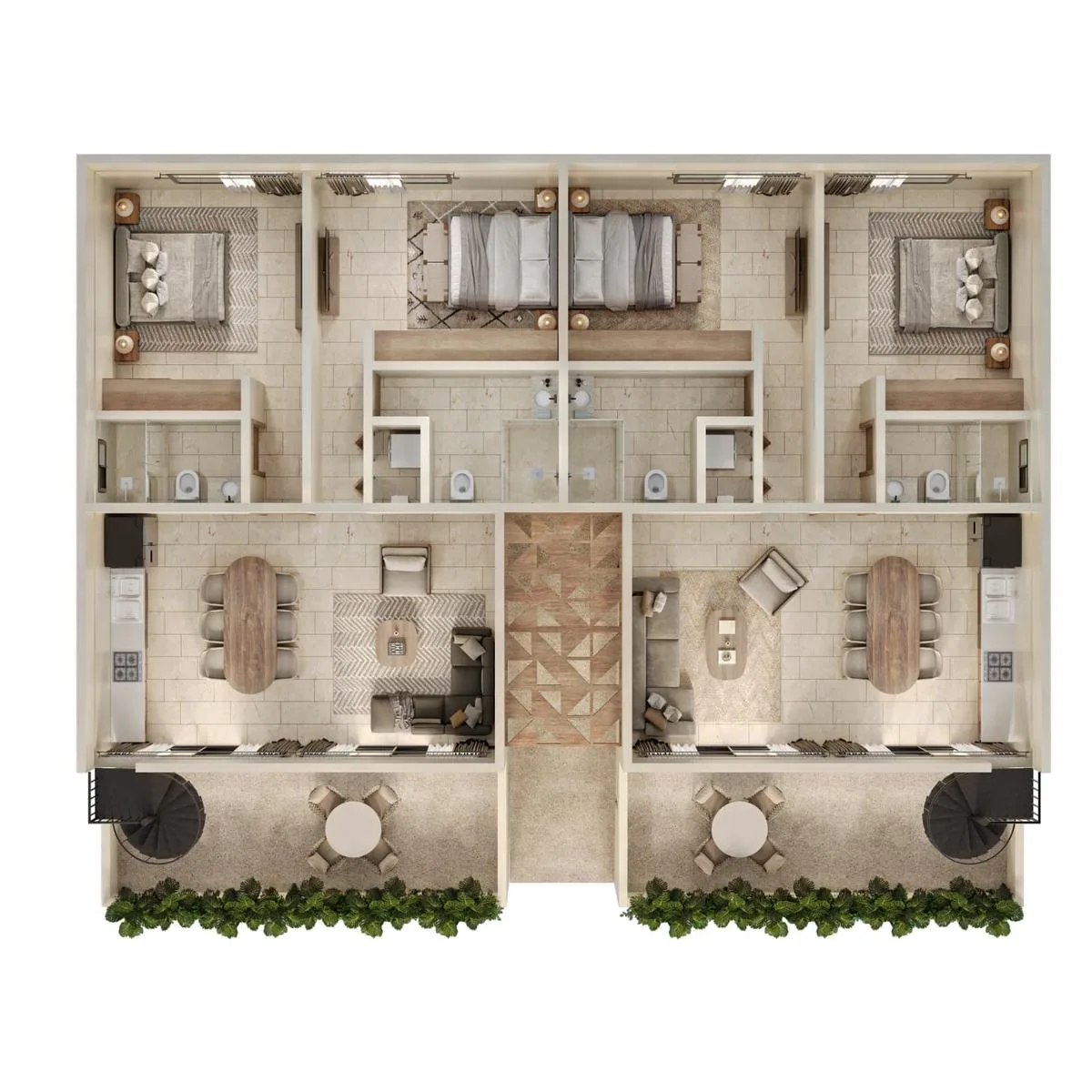 For wellness and leisure, the community offers a climate-controlled gym, barbecue areas, a chill-out zone, and a coworking space. Bathroom facilities are also available throughout the common areas.