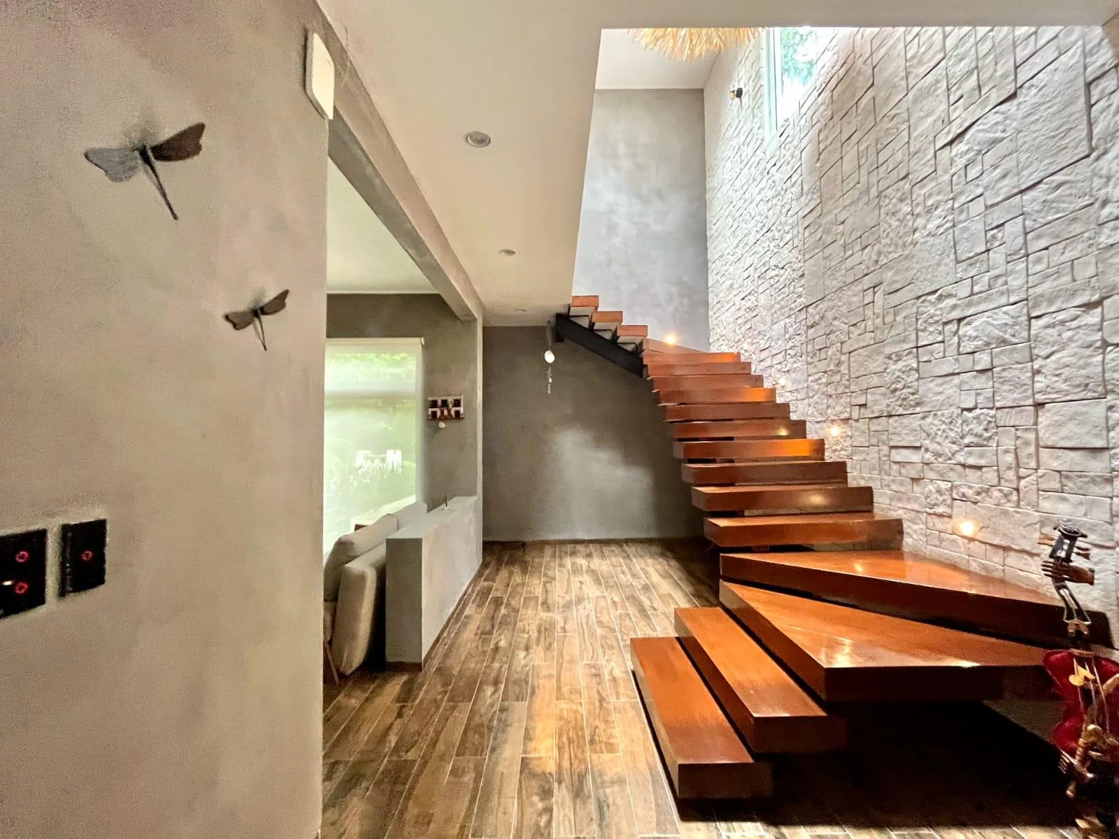 This beautiful house features three bedrooms. Two bedrooms with en-suite bathrooms are located upstairs. A ground-floor studio offers independent access and direct access to the pool.