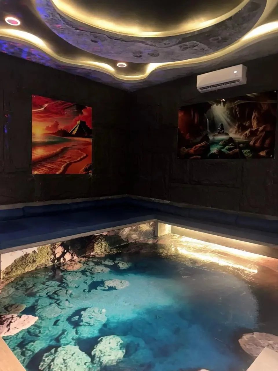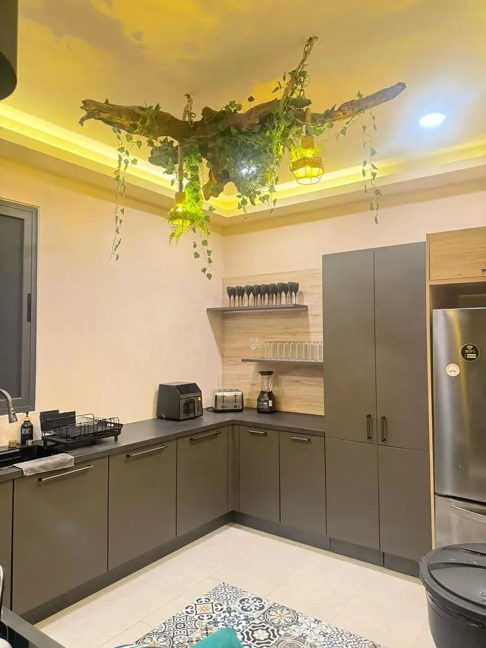 The home includes four bedrooms and five and a half bathrooms. The master bedroom features a private jacuzzi. The layout includes a living room and a fully equipped kitchen with high-end finishes, as well as a bar area for entertainment.