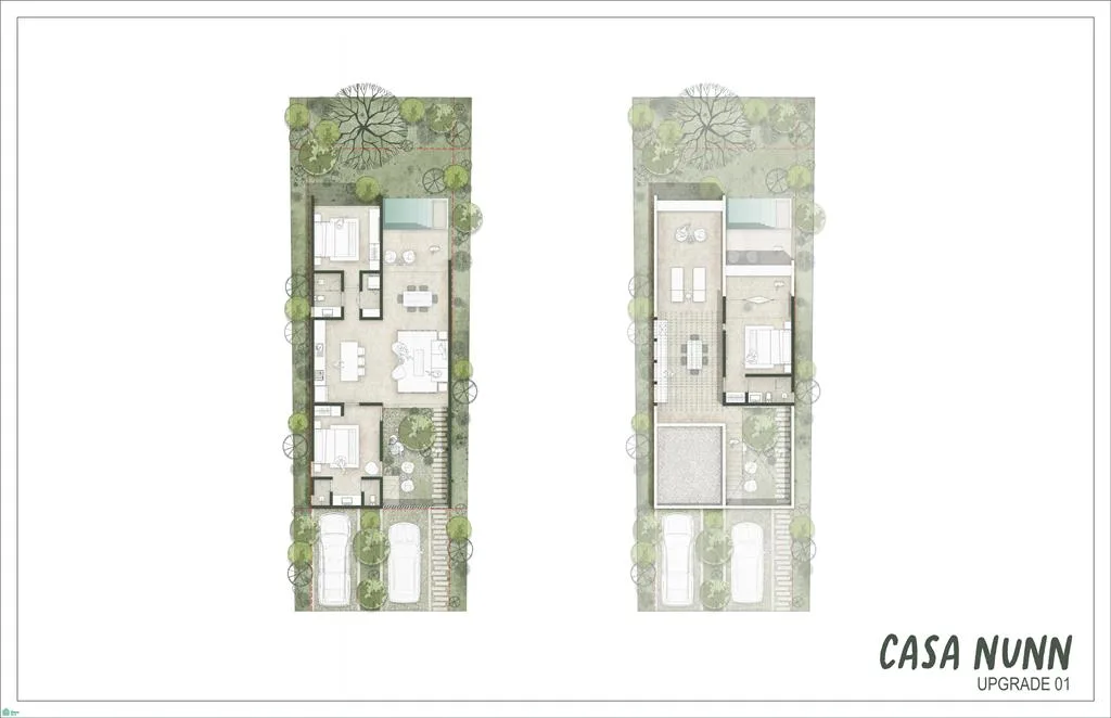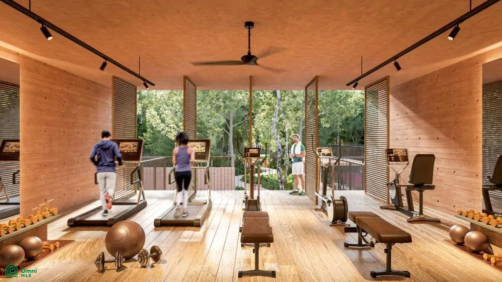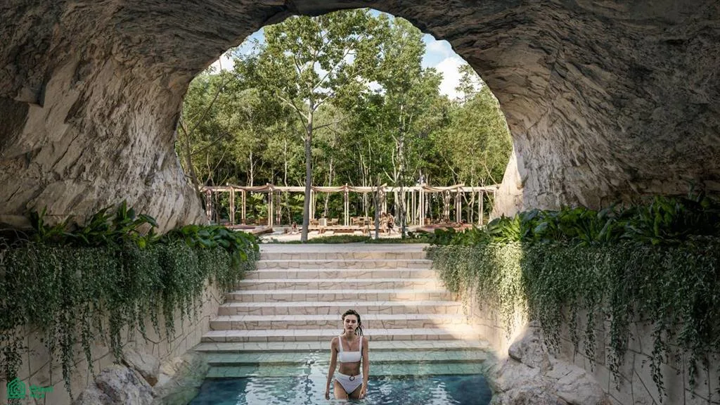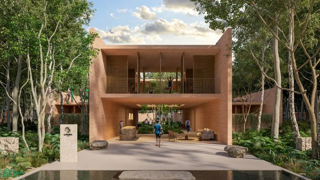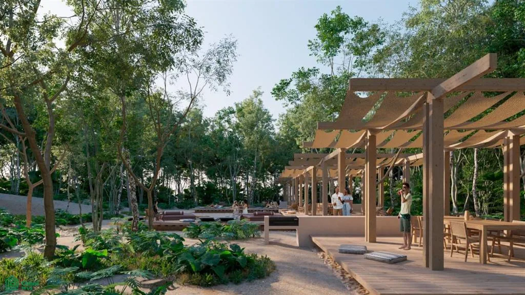 Community amenities include a skate park, a cenote club, and multiple pools such as lounge, family, salt water, jacuzzi, teen, and kids pools. There is a children's playground, trails surrounded by vegetation, and sports courts for tennis, paddle tennis, basketball, and pickleball. Additional features are a gastro club with a pizza oven and grills, a yoga studio, indoor and outdoor gyms, an orchard, a pet park, four swimming lanes, a business center, a retail area, an outdoor cinema, wildlife crossings, and a bike path.
