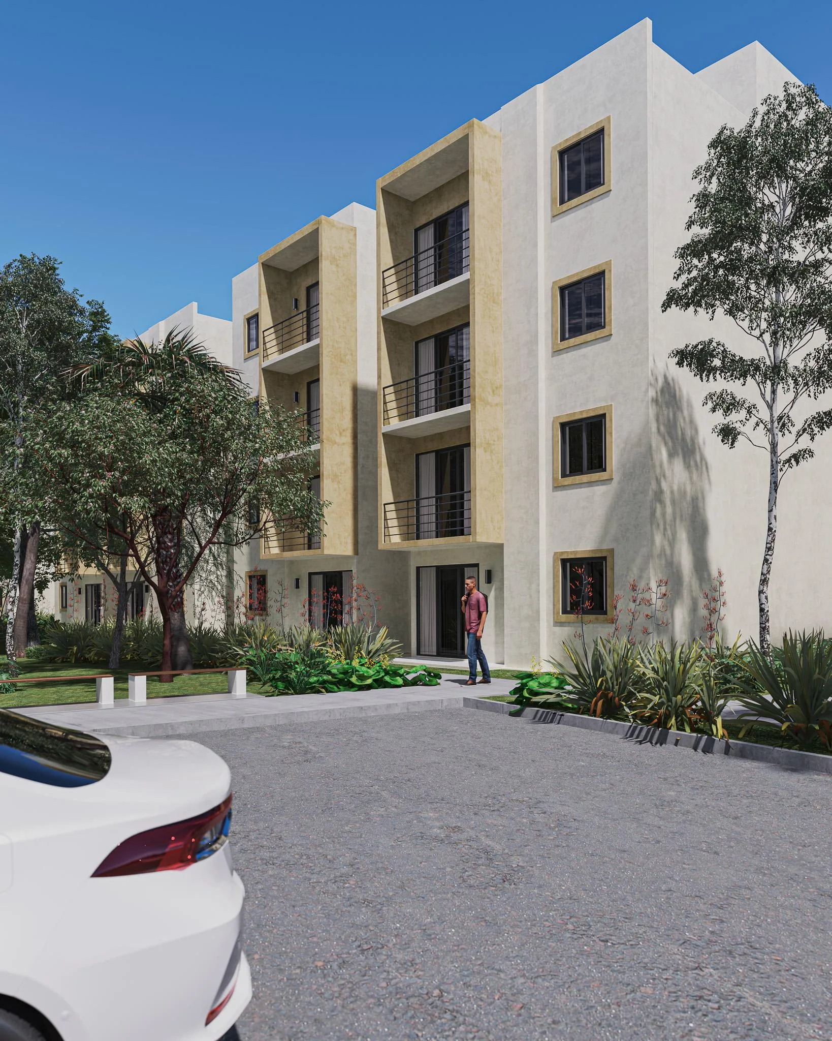 This modern two-bedroom residence spans 87 square meters. The intelligent layout integrates a spacious living-dining room that flows into a fully equipped kitchen with a granite breakfast bar. The primary bedroom includes a walk-in closet and a full bathroom. The secondary bedroom offers versatility for guests, family, or creative use, and is complemented by a full bathroom, a laundry area, and the possibility of a terrace or balcony that extends the living space outdoors.