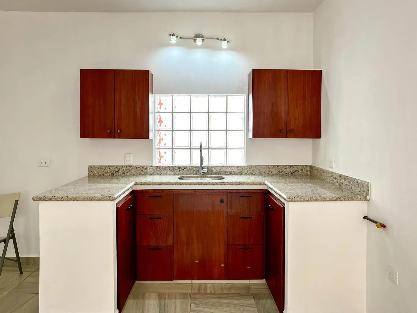 Discover the charm of this newly remodeled three-bedroom home in Chemuyil. It combines modern aesthetics with traditional appeal, offering a spacious living area and a kitchen with wooden cabinets and granite countertops.