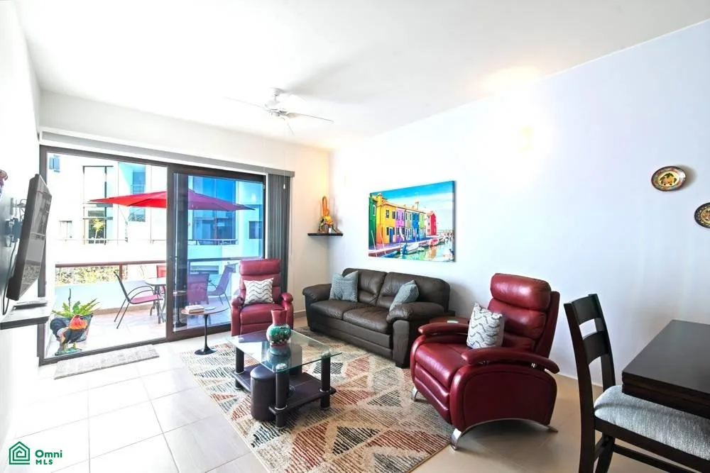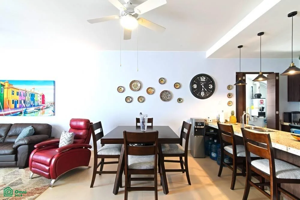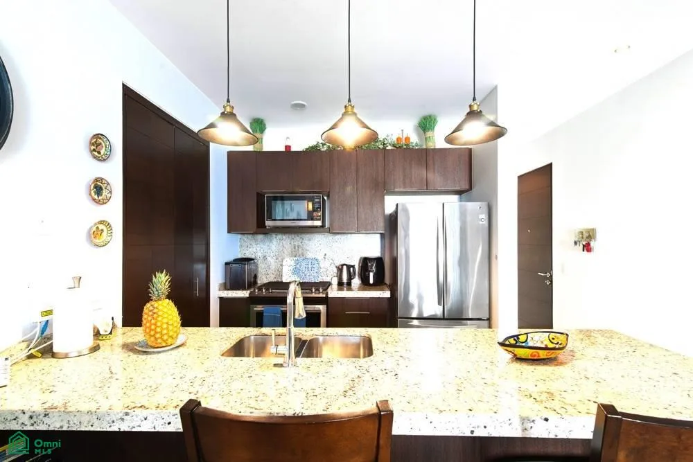 This penthouse features two bedrooms and two bathrooms. The spacious open floor plan is filled with abundant natural light. The fully equipped kitchen includes an island. A wide balcony with an outdoor grill provides additional living space, and a staircase leads to a private rooftop terrace equipped with a jacuzzi.