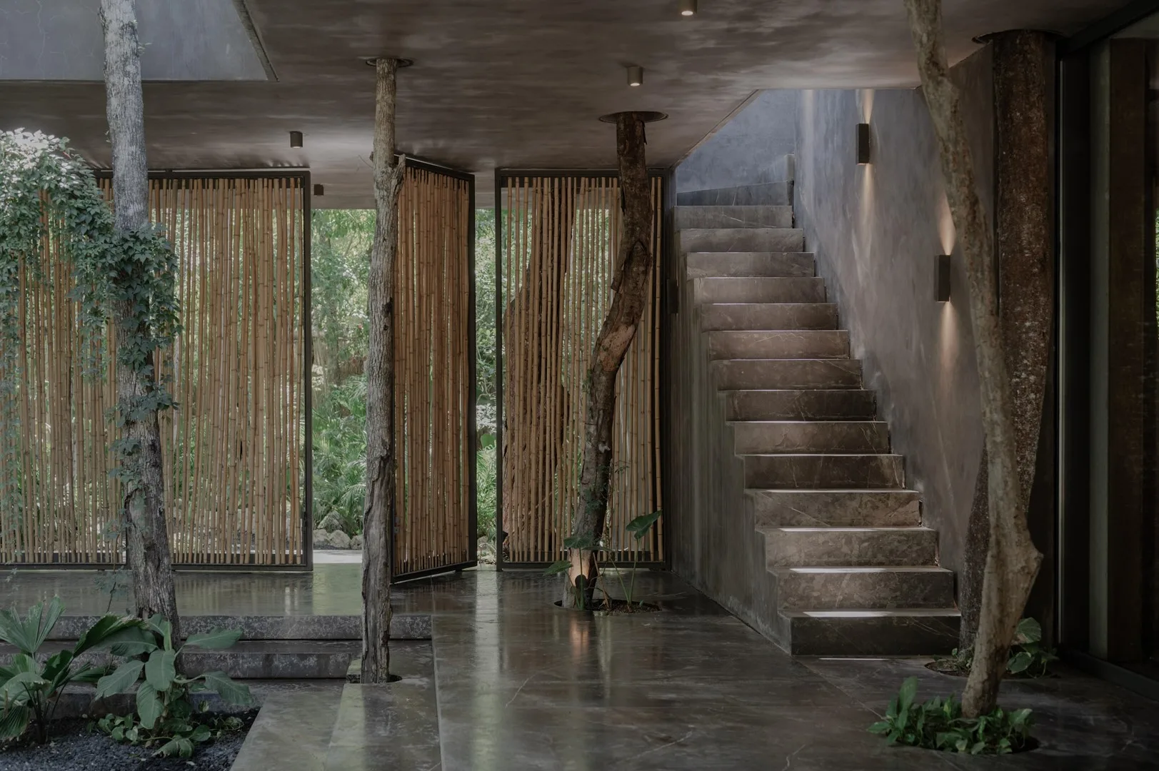 The residence is situated within a lush, jungle-like setting offering complete privacy. Its design embodies a wabi-sabi aesthetic, creating a seamless indoor-outdoor feeling.