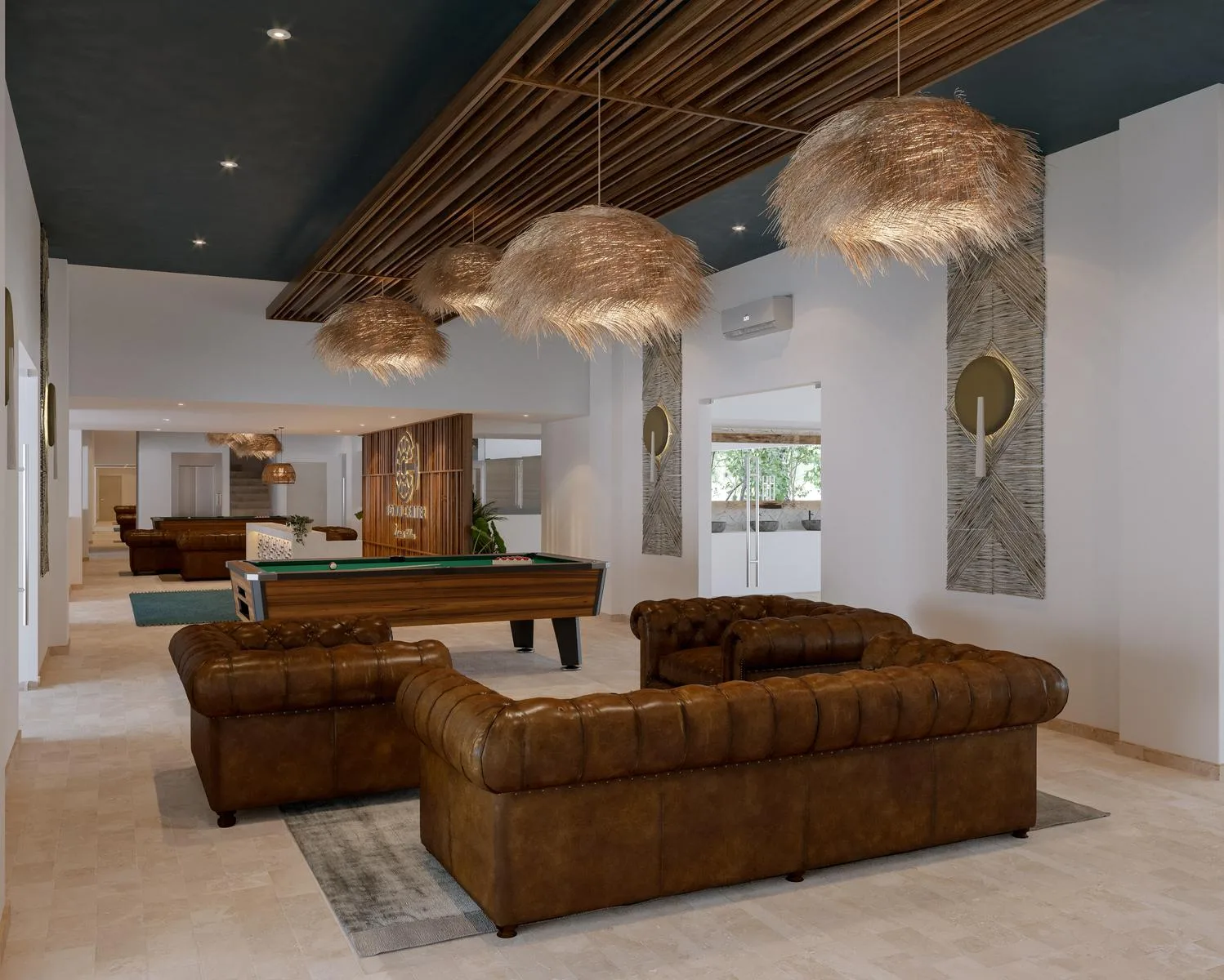 Building amenities include a lobby, gym, coworking space, swimming pool, cinema, laundry facilities, management services, lounge chairs, a bar, a playroom, a terrace, a game room, and a pool table.