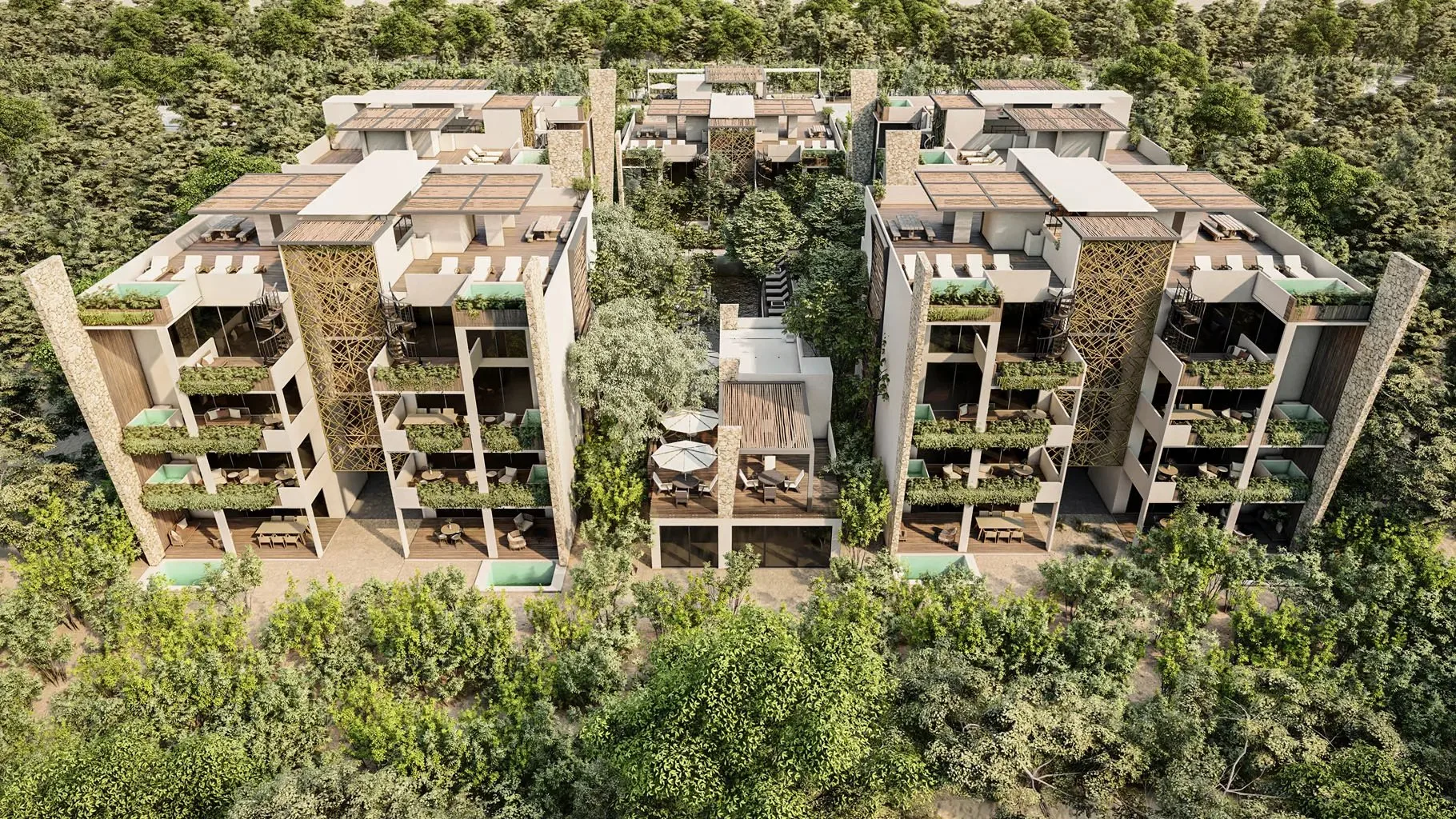The penthouse condos are part of a residential community within Tulum Country Club in Tulum, Quintana Roo. The community is located near the sea and features natural trails, green spaces, and preserved native vegetation.