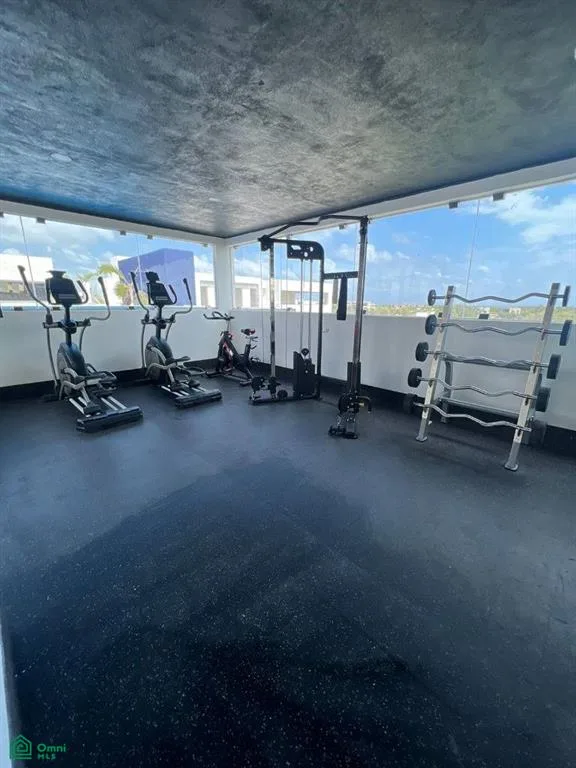 Building amenities include a rooftop pool, private grills, a film library, elevator access, a gym, and a co-working space. There are also common rooftop areas. The building provides 24-hour security.
