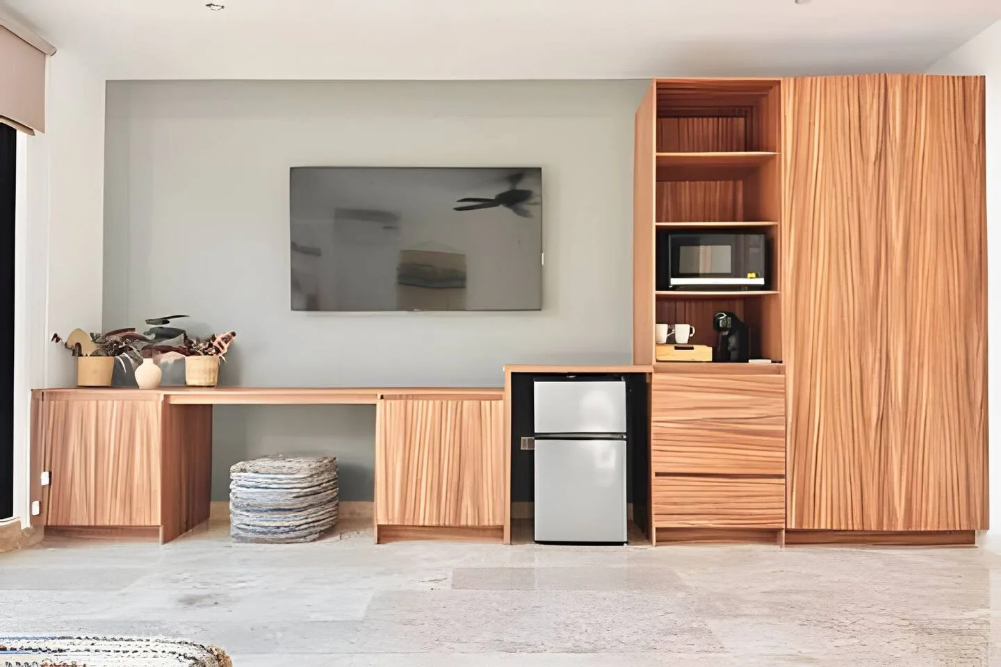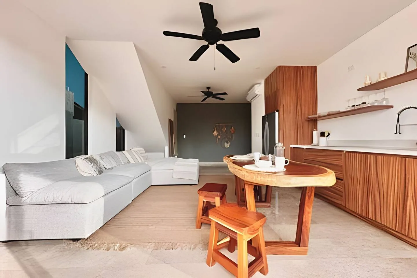 The lower level includes an open kitchen and a spacious terrace that is ideal for outdoor dining. The interiors are finished with local natural materials.