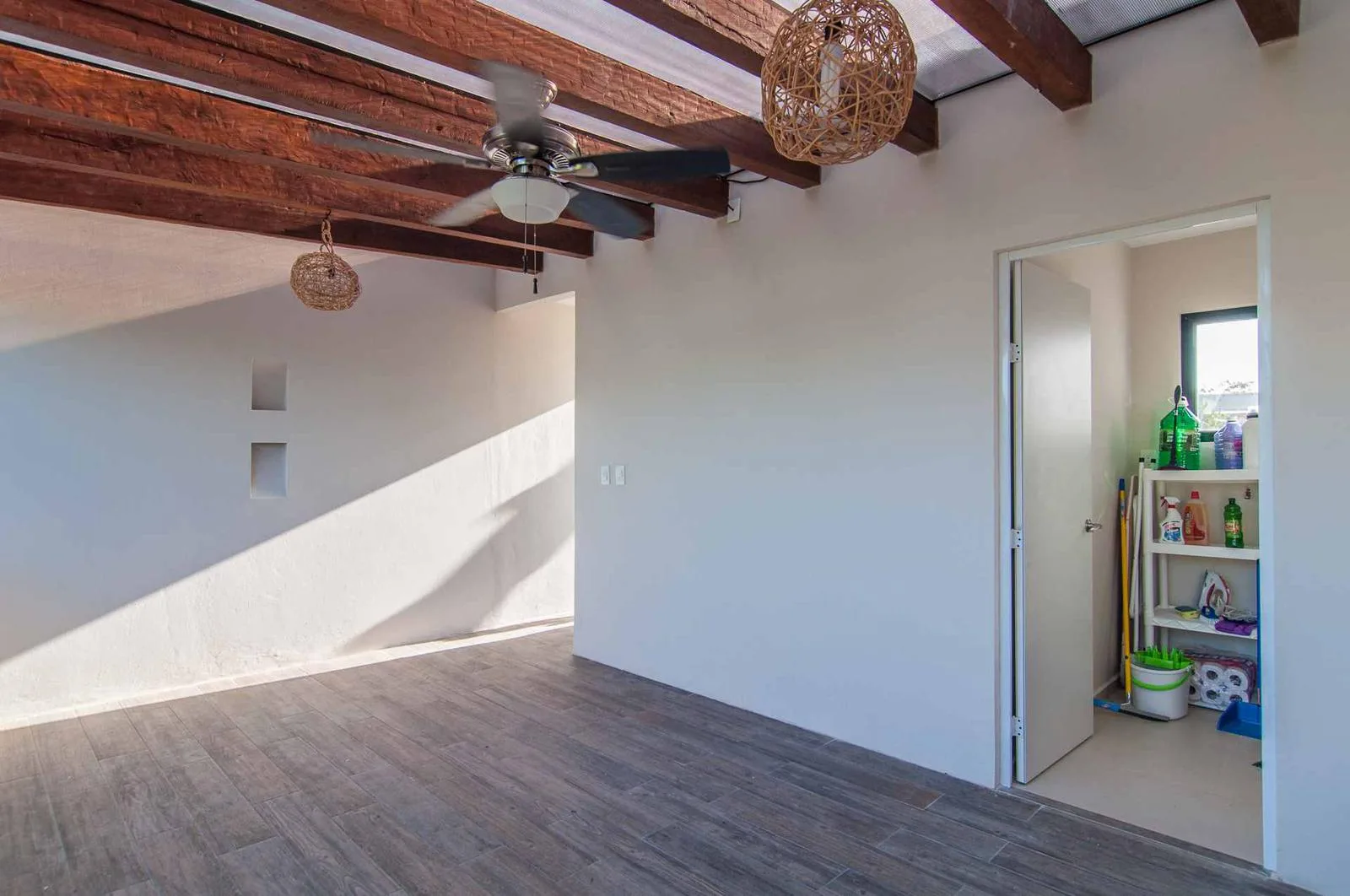 The second floor offers two bedrooms. The third floor contains a laundry room and a wide covered rooftop terrace with a pergola, suitable for entertainment.