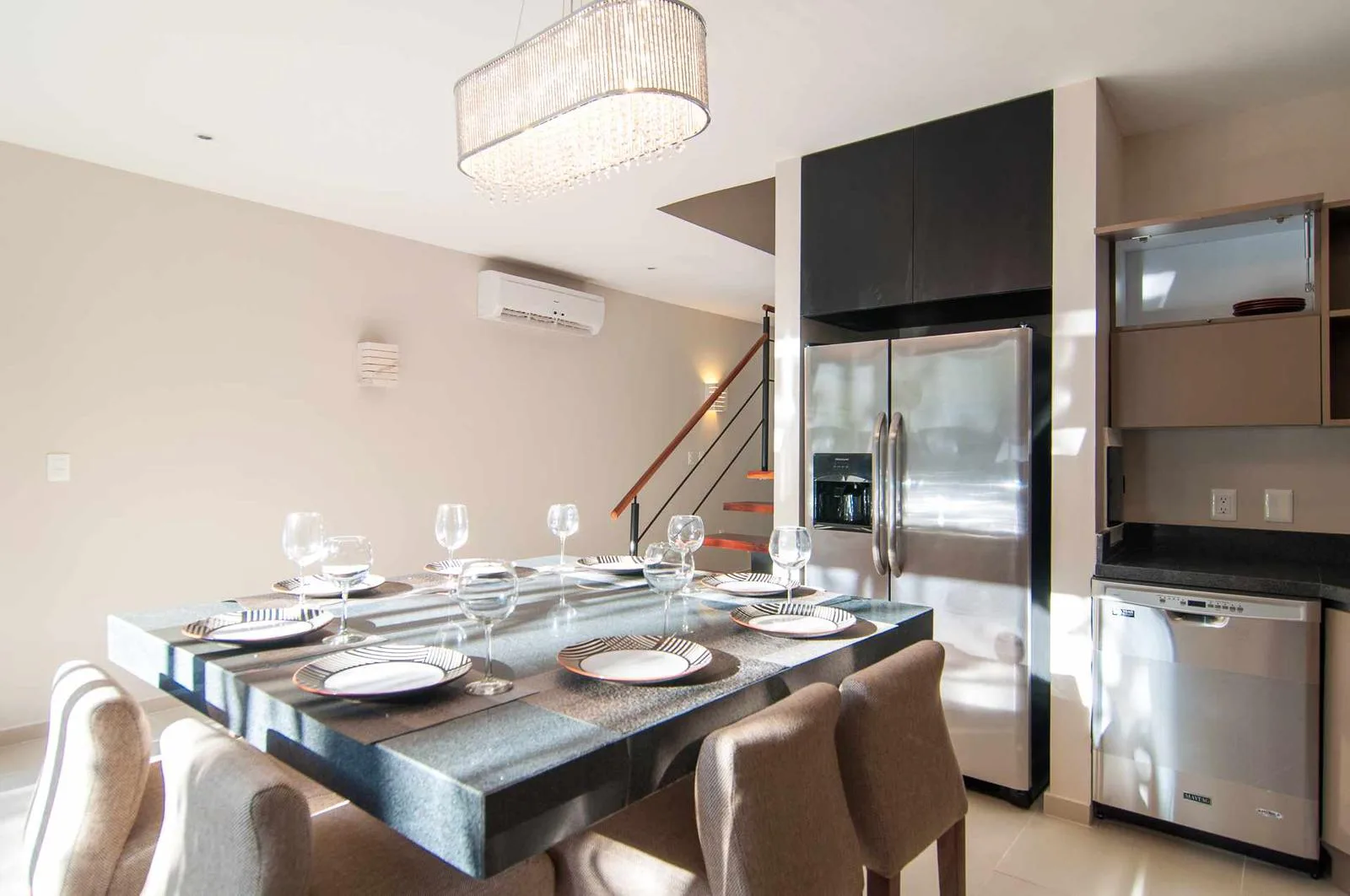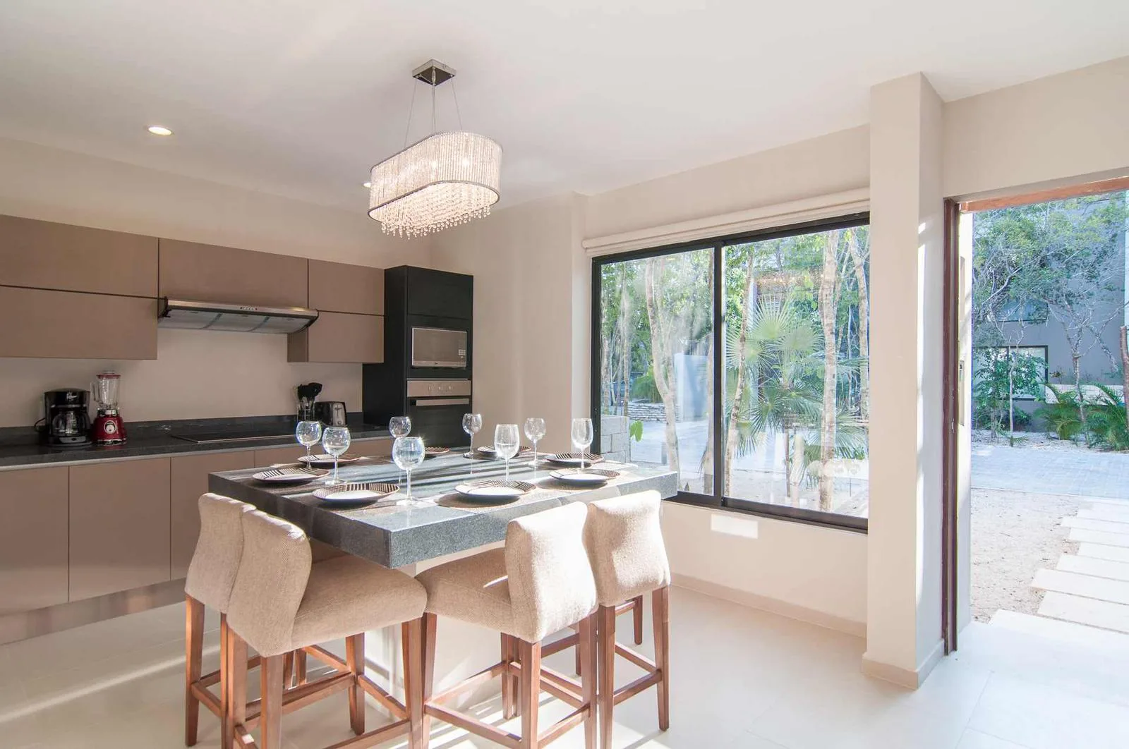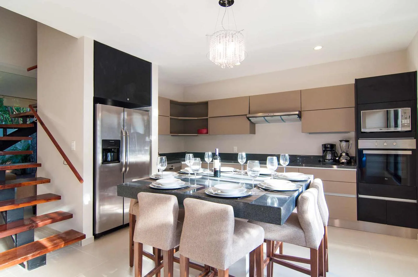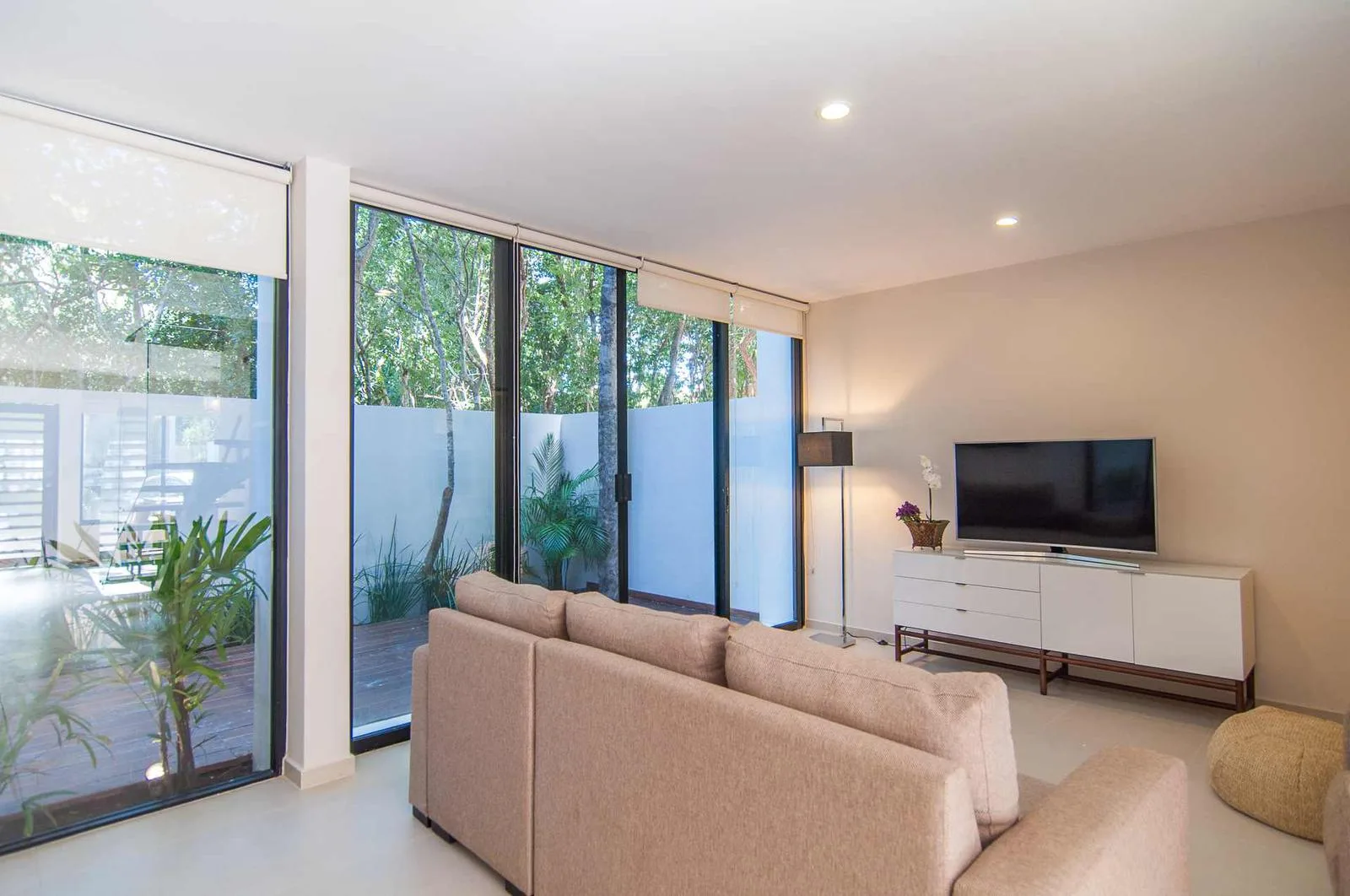 Upon entering the villa, a floating wooden staircase and floor-to-ceiling windows that connect to the outdoor patio integrate the space with nature. The entry level includes a spacious kitchen with a granite island and surrounding cabinets. This level also houses a half bathroom, a living room, and a private patio with tropical landscaping and a hardwood deck.