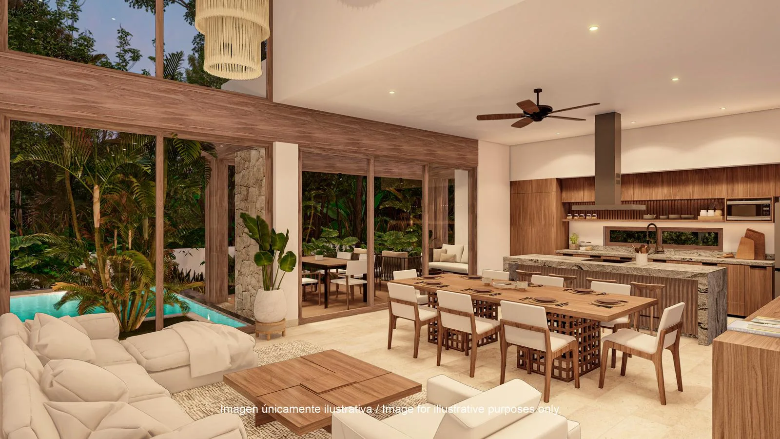 The architectural design maximizes natural light, cross ventilation, and a seamless connection to the gardens. The ground floor contains the primary social areas and features a connection to the outdoors. It includes a main living room with views of the pool and garden, a spacious dining room, and a gourmet-style kitchen with a central island and breakfast bar. A covered terrace integrates with the exterior area, and there is a private swimming pool surrounded by tropical landscaping. An additional living space can function as a TV room or office, and a strategically placed half bathroom is available for guests.