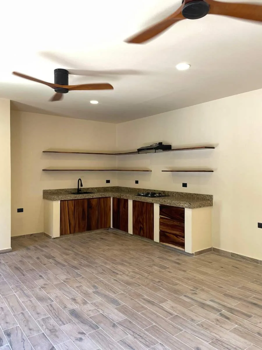 The interior features an open-plan layout that creates a seamless flow between the living, dining, and kitchen areas. The design incorporates a bohemian style with local materials such as chukum and tzalam wood.