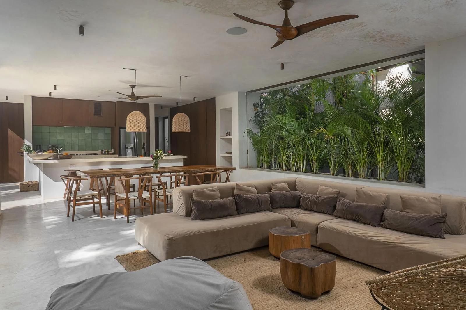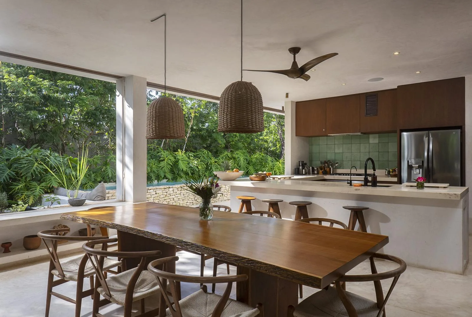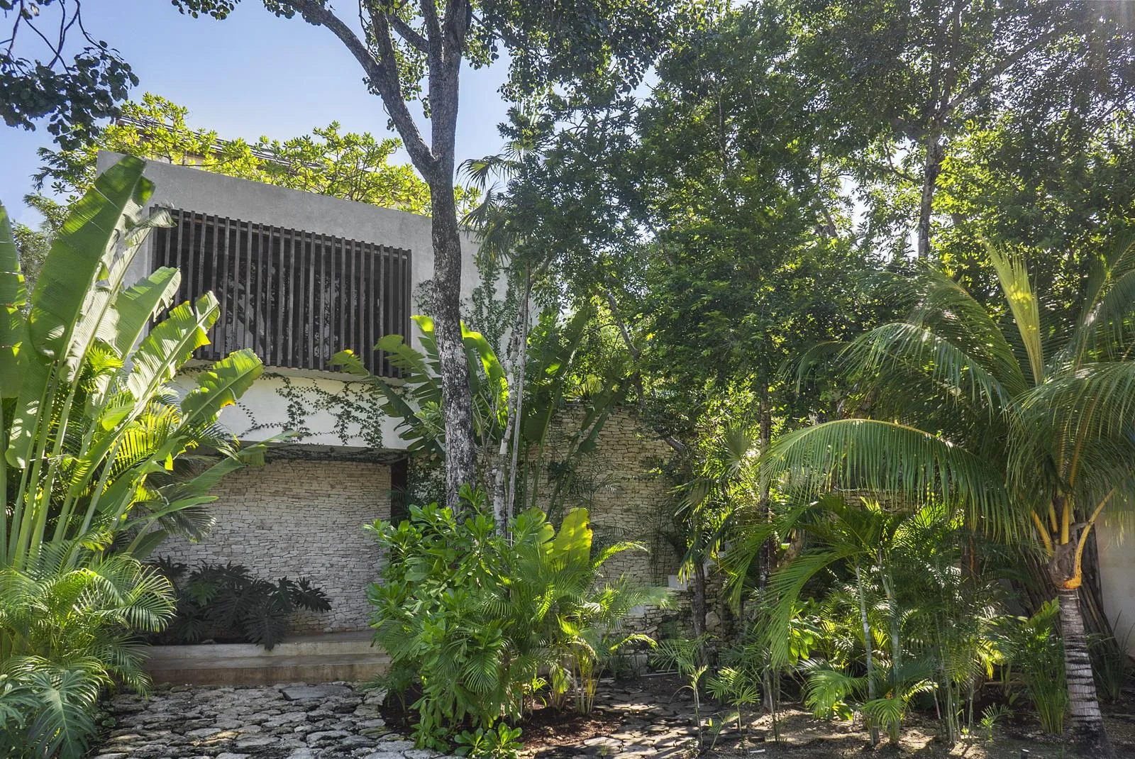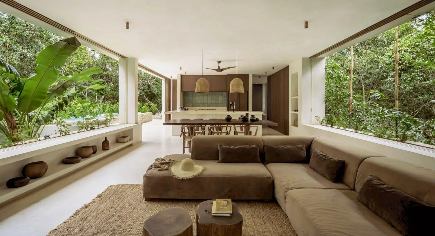 This villa combines contemporary architectural design with natural elements from the region. It is situated within the gated community of Aldea Zama in Tulum.
