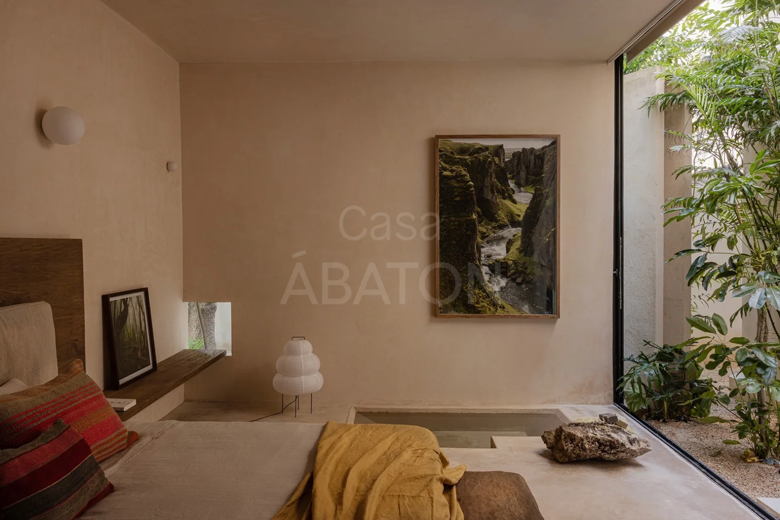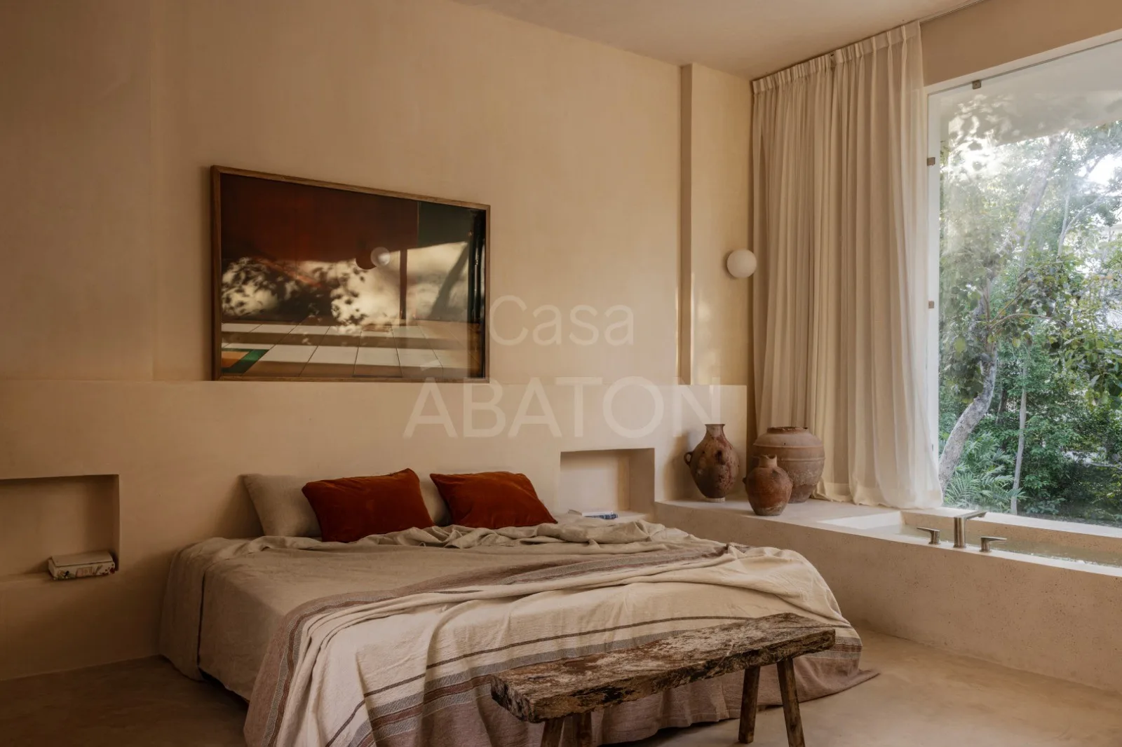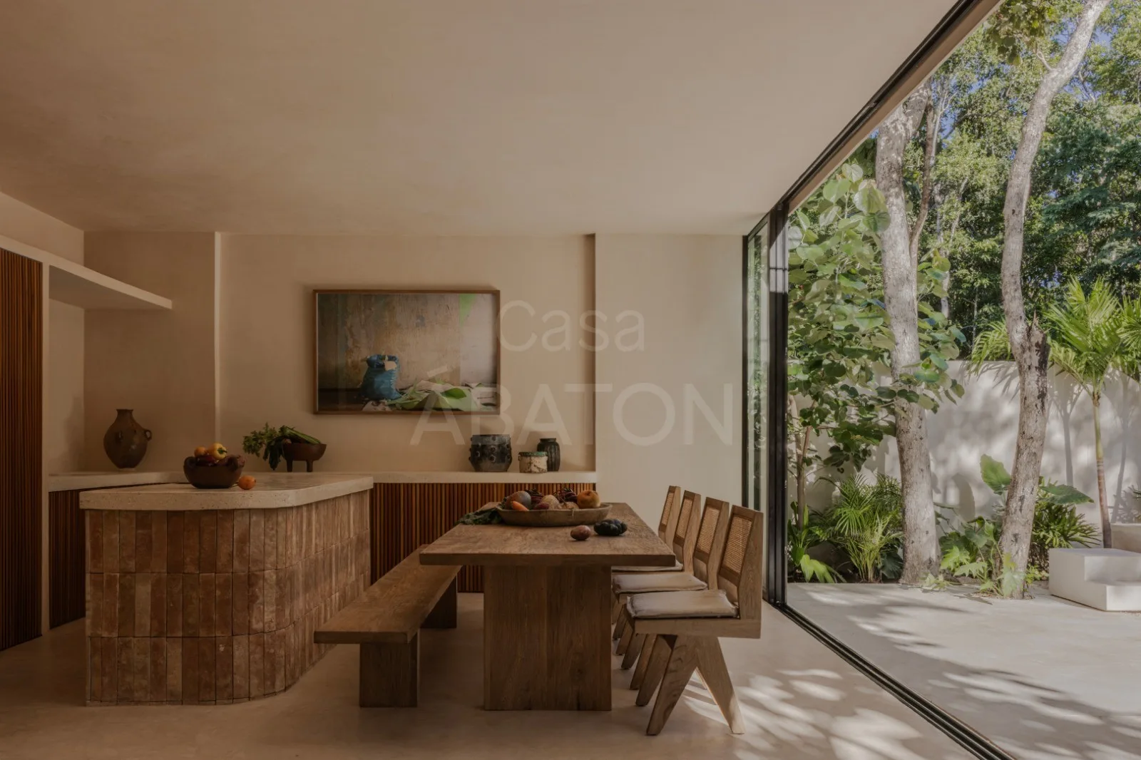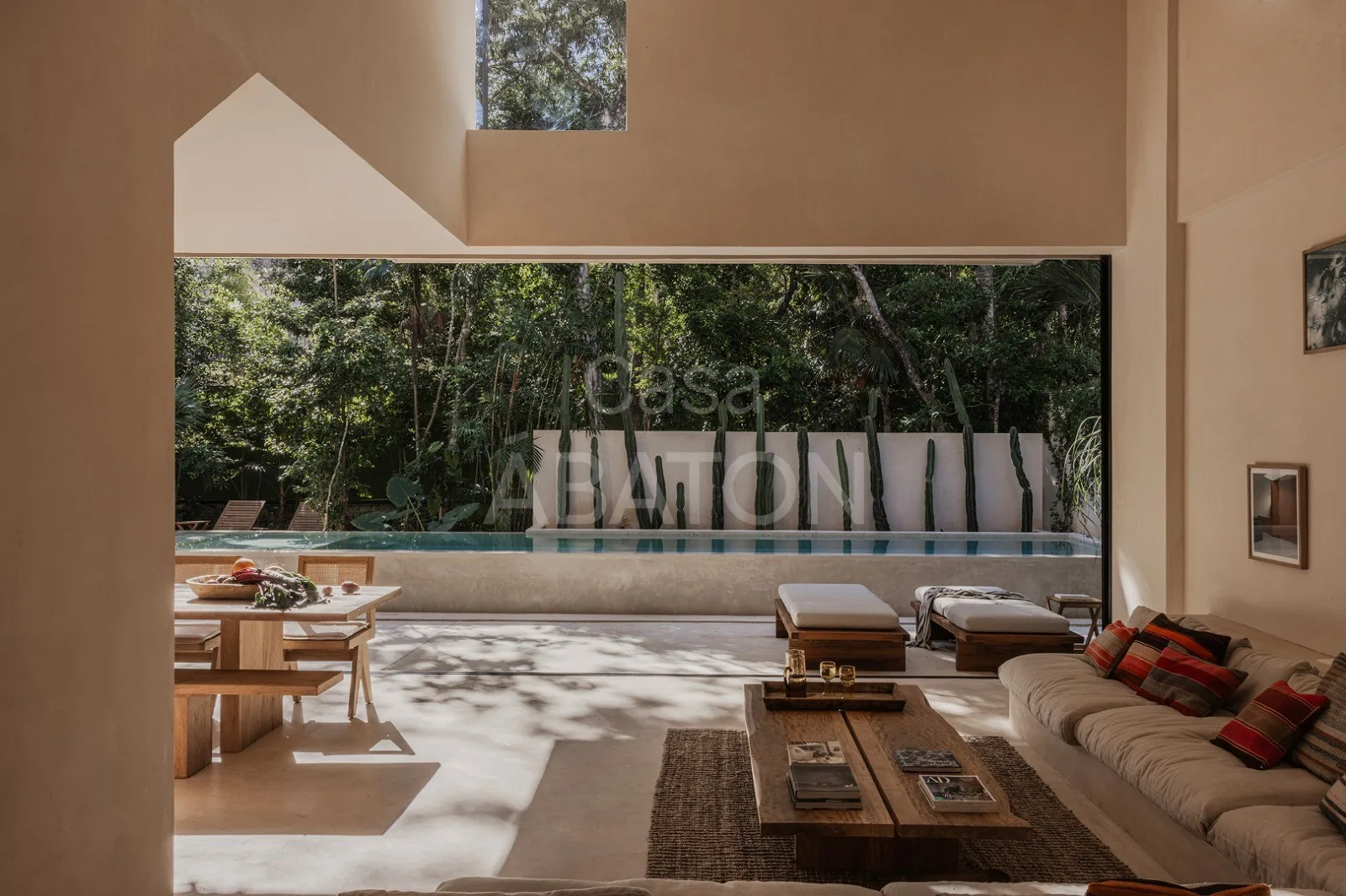 The finishes are natural and minimalist, resulting in a refined, functional, and timeless atmosphere. The property features two swimming pools. One is on the ground level, integrated into the main living areas, and the other is on the rooftop terrace, designed for year-round enjoyment of the Tulum climate. The house is delivered fully furnished and ready for occupancy.