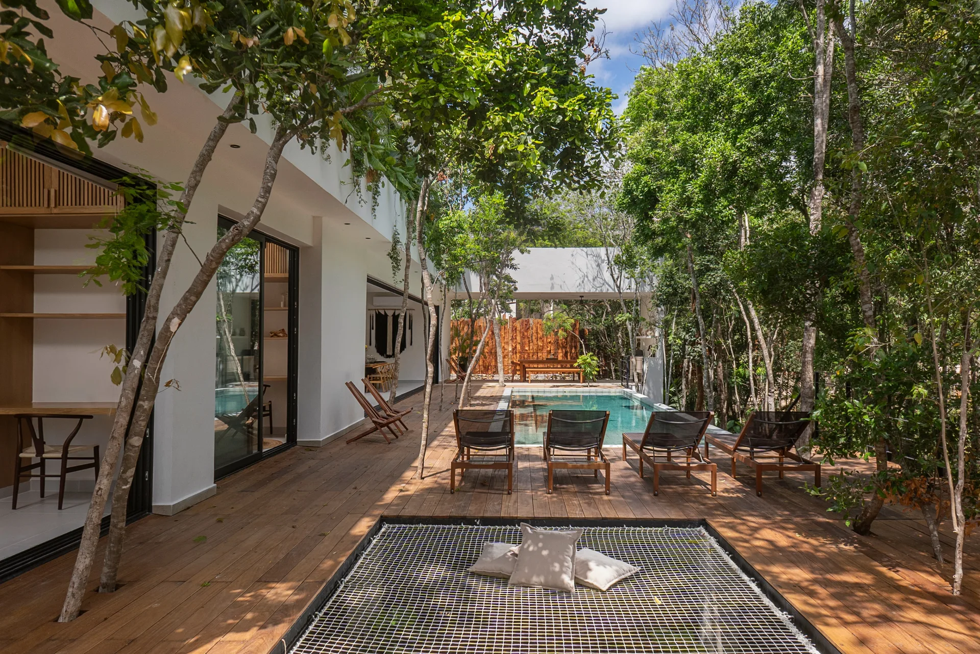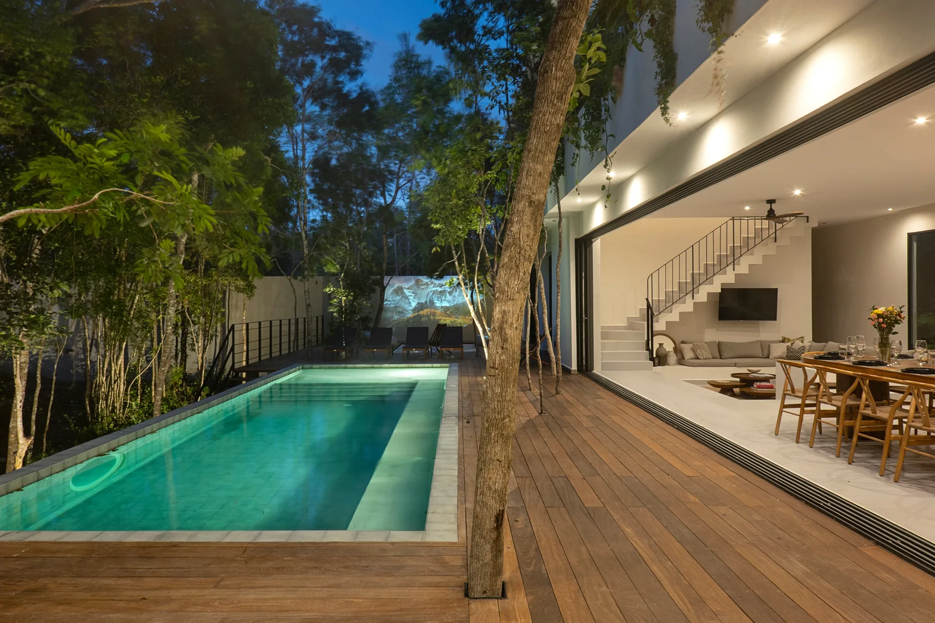 The villa is masterfully built on stilts. The ground floor features a signature sunken living room that opens through expansive pocket doors to a floating terrace. This terrace includes an emerald-toned pool, a professional BBQ area, and a multi-use lounging net.